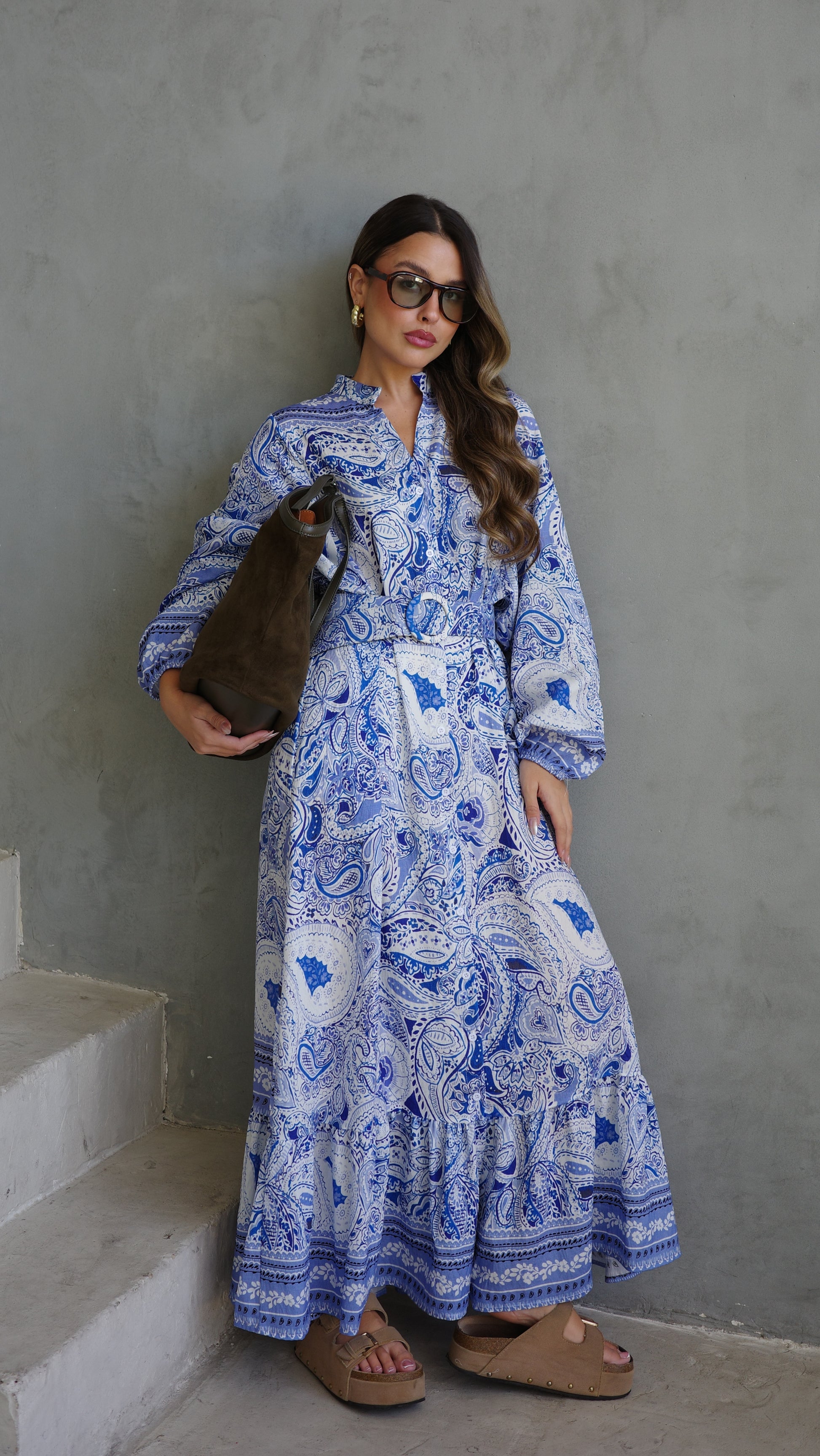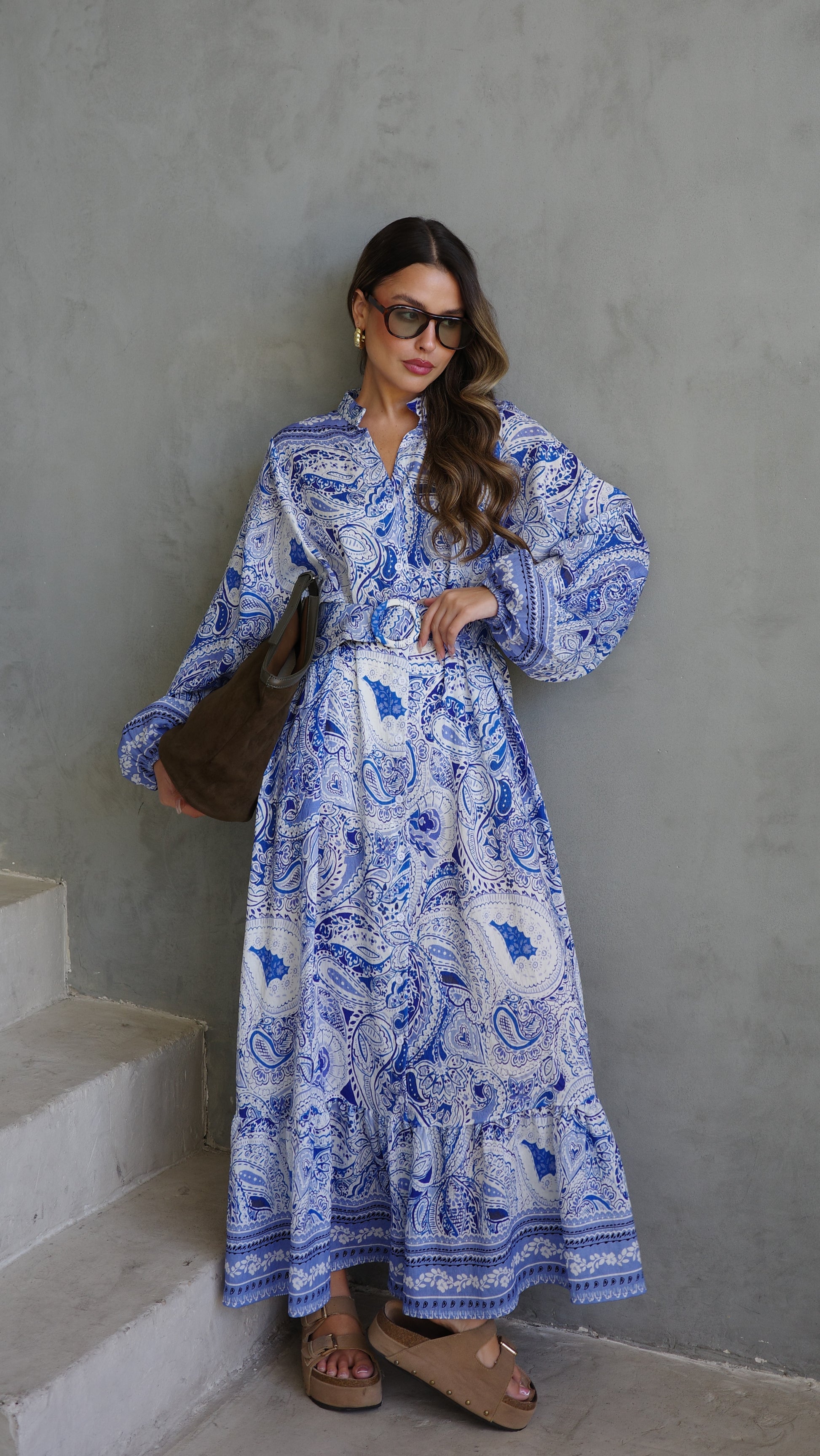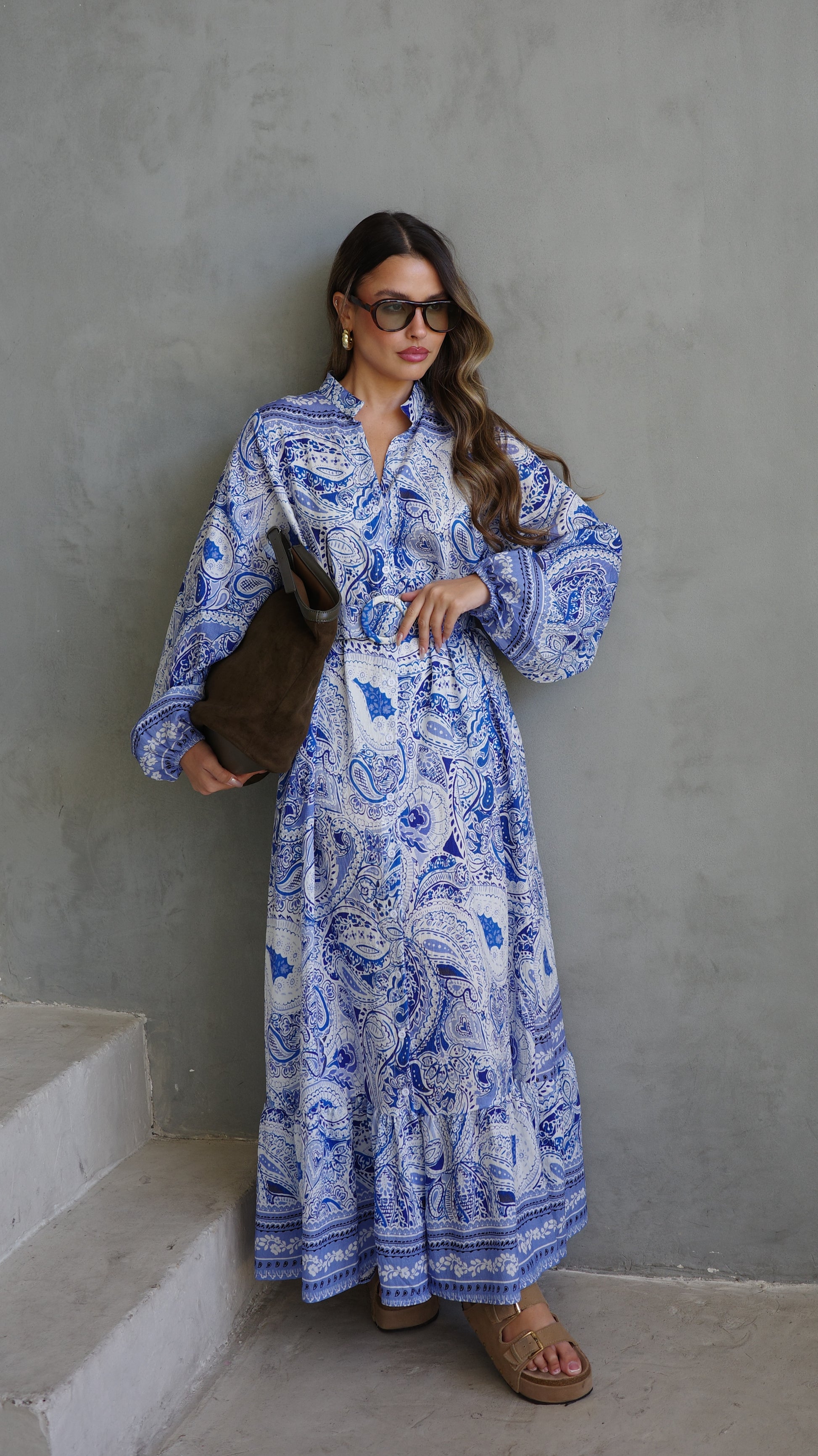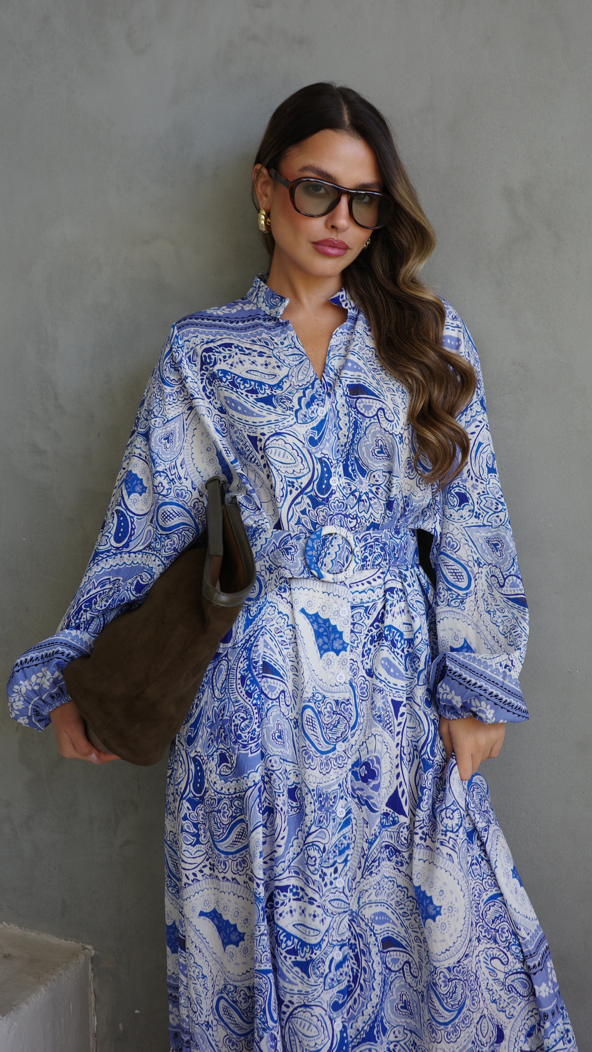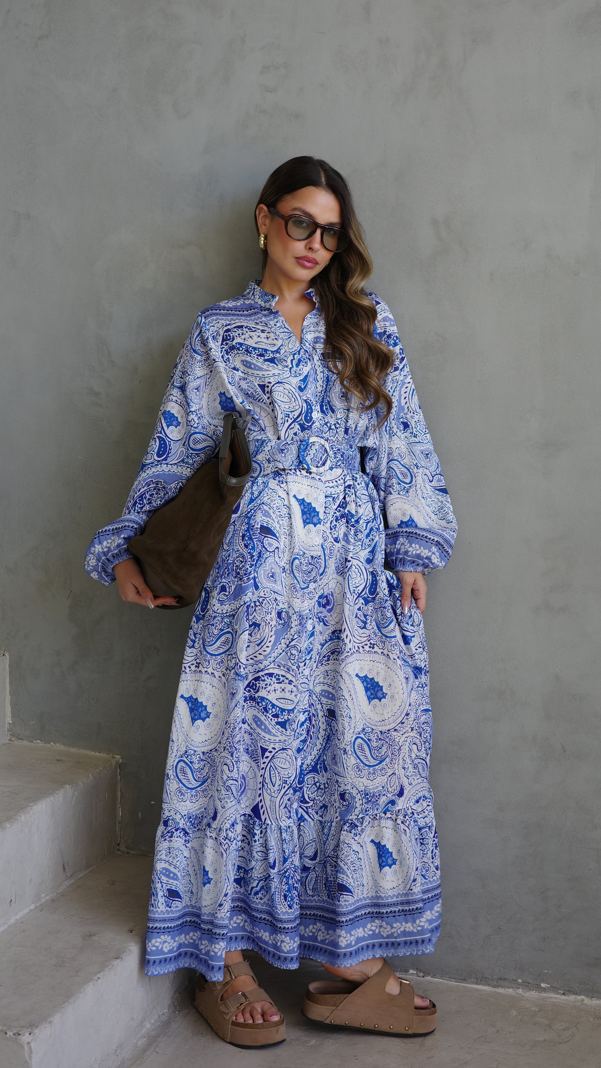 גלביה קומות כפתורים חגורה רייצל | תכלת/לבן