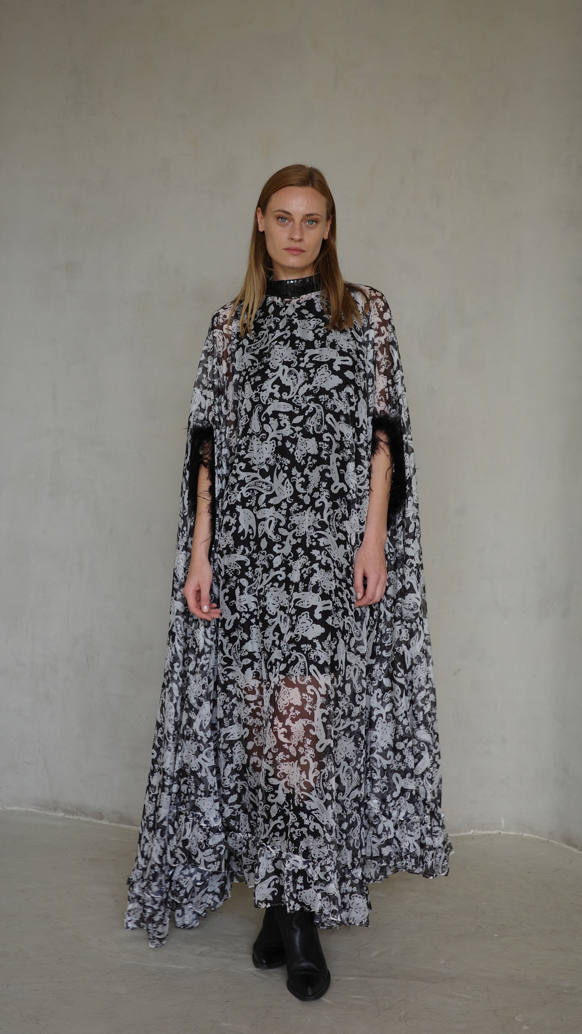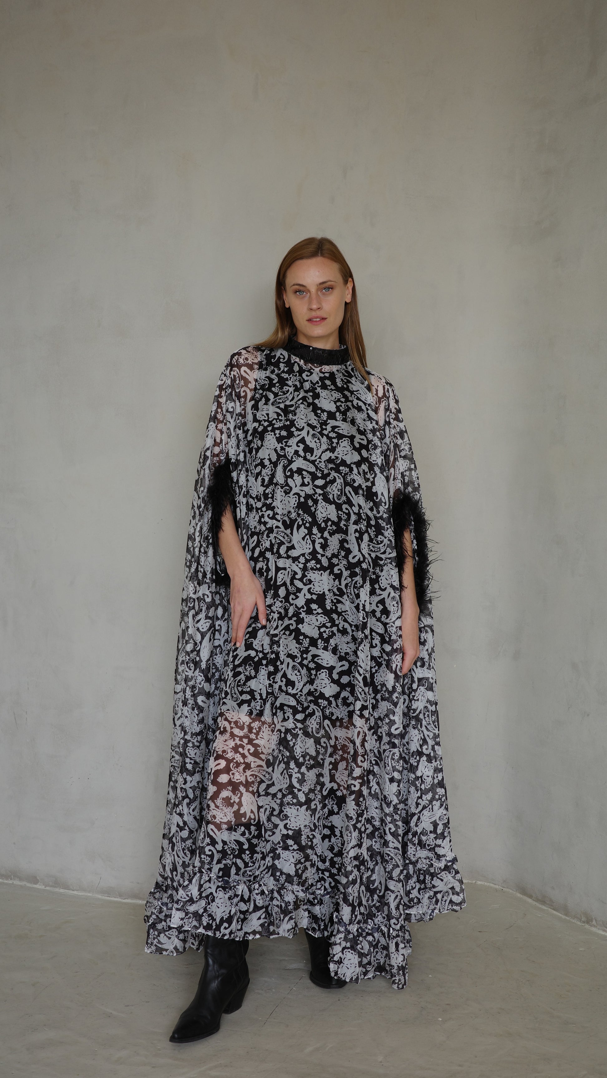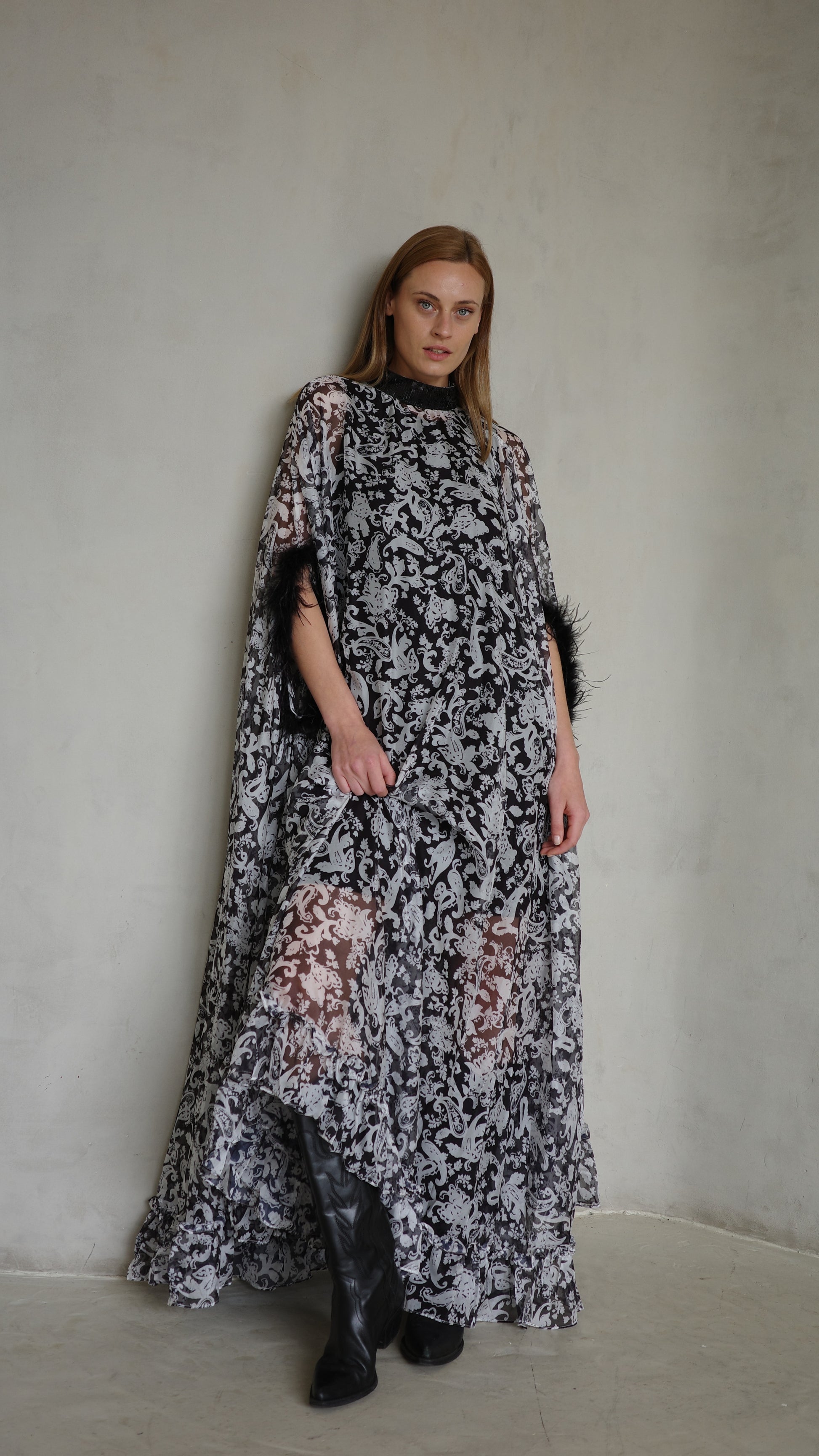 שמלה בגזרת אוברסייז מבד שיפון מודפס ונשפך