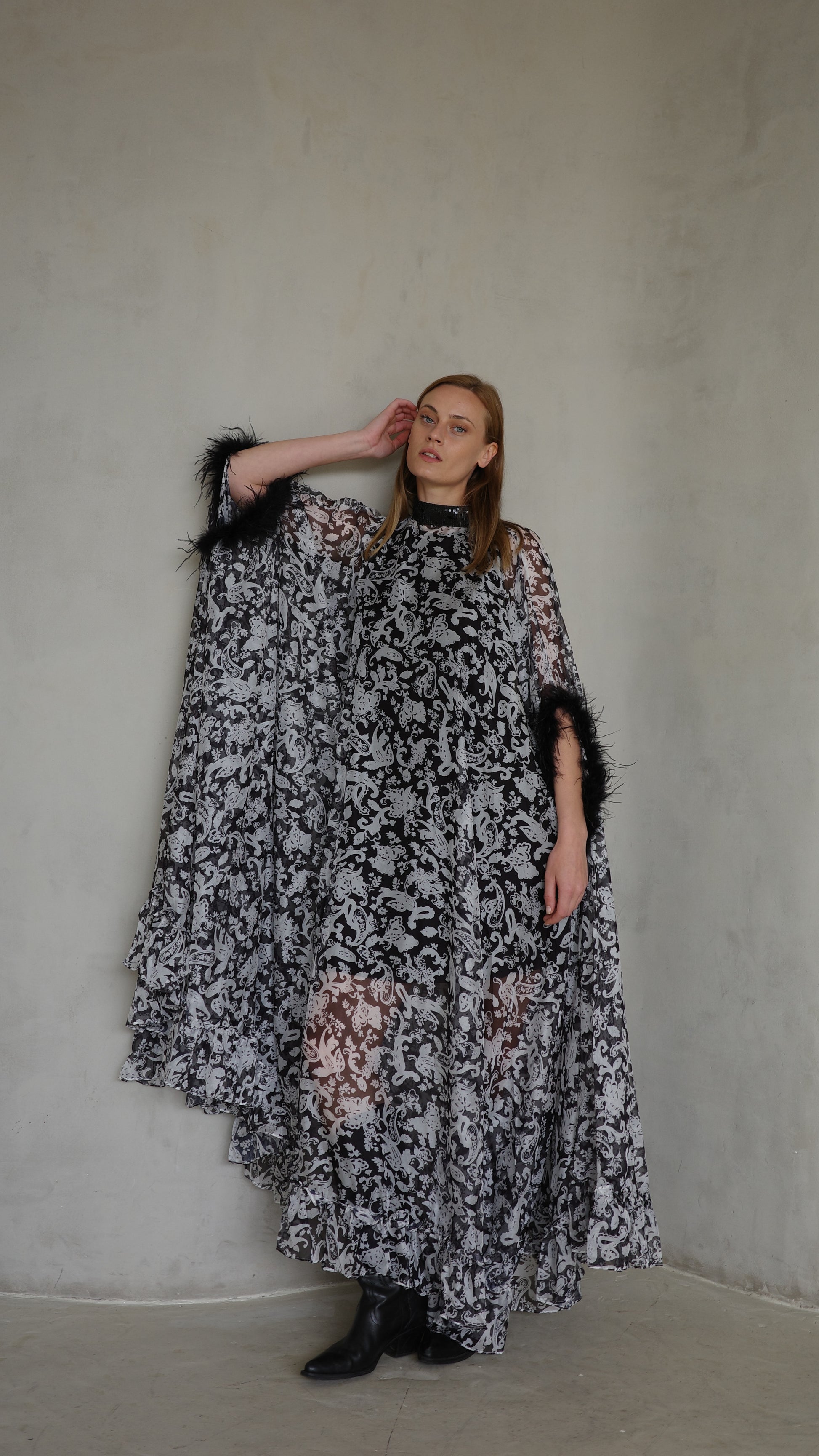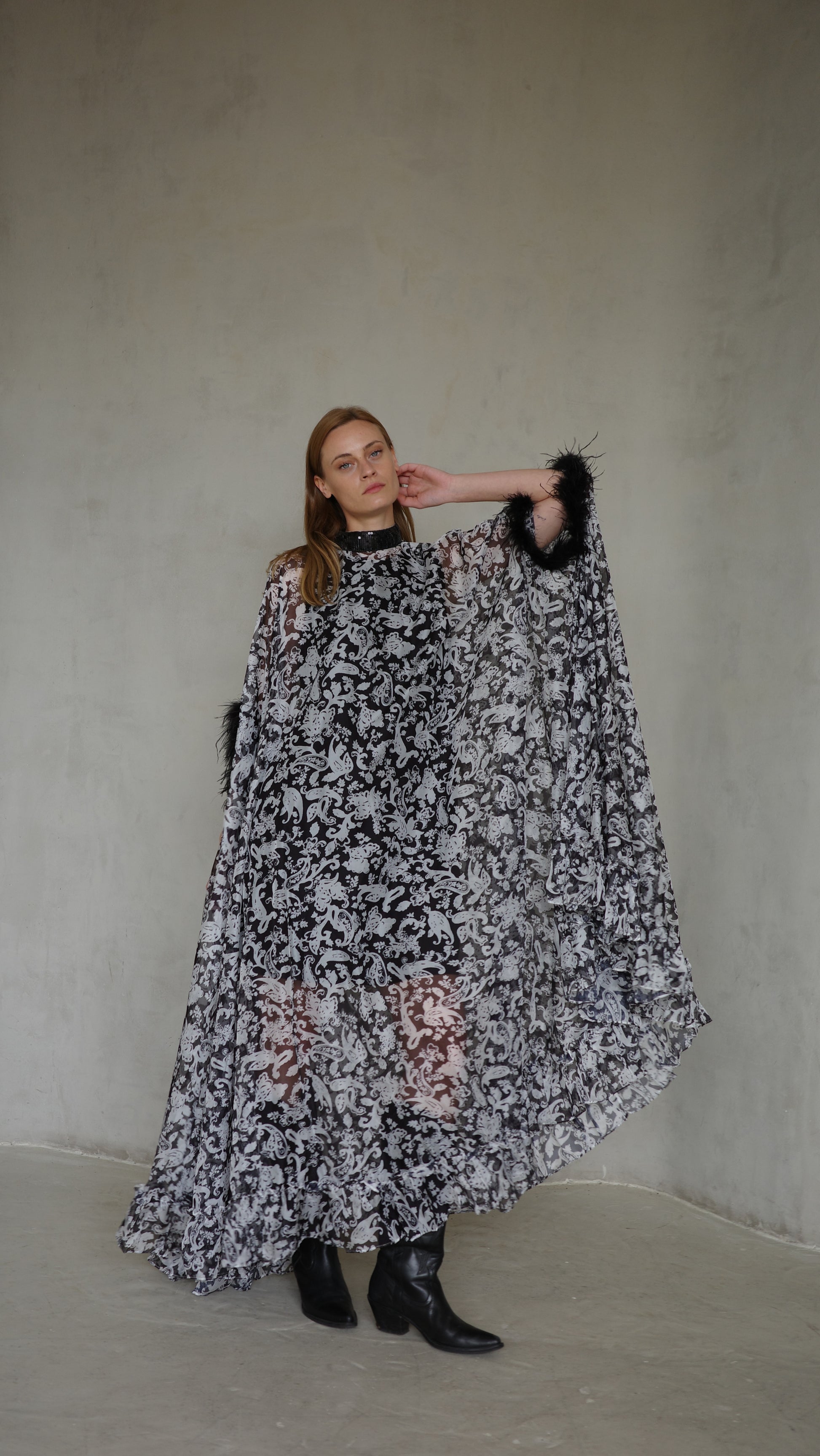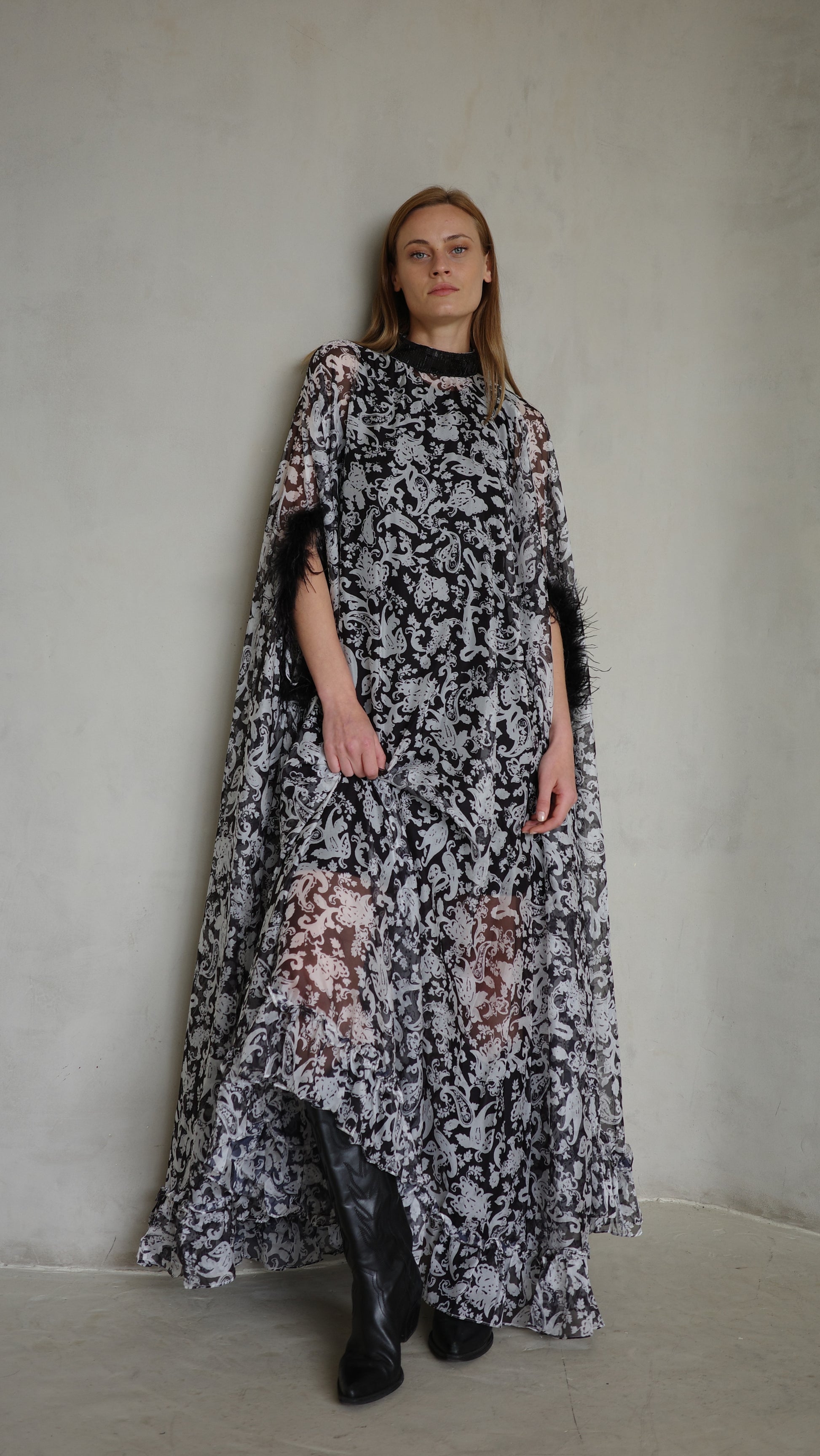 שמלה בגזרה רחבה במיוחד מעוגלת 6 מטר בד שיפון קל ונשפך בשילוב שמלת גופית בטנה ברך וסיומת קומת מלמלה קטנה