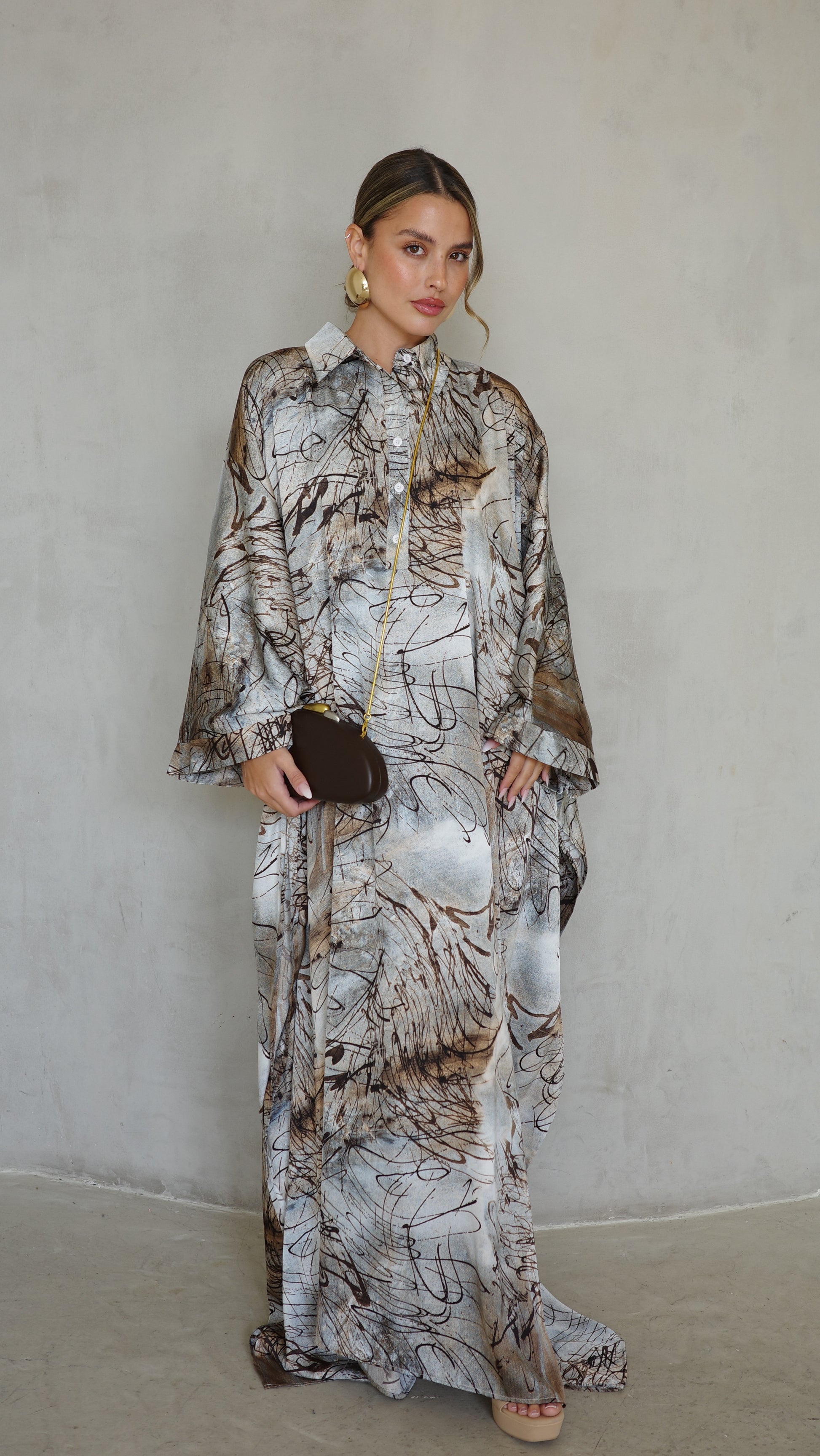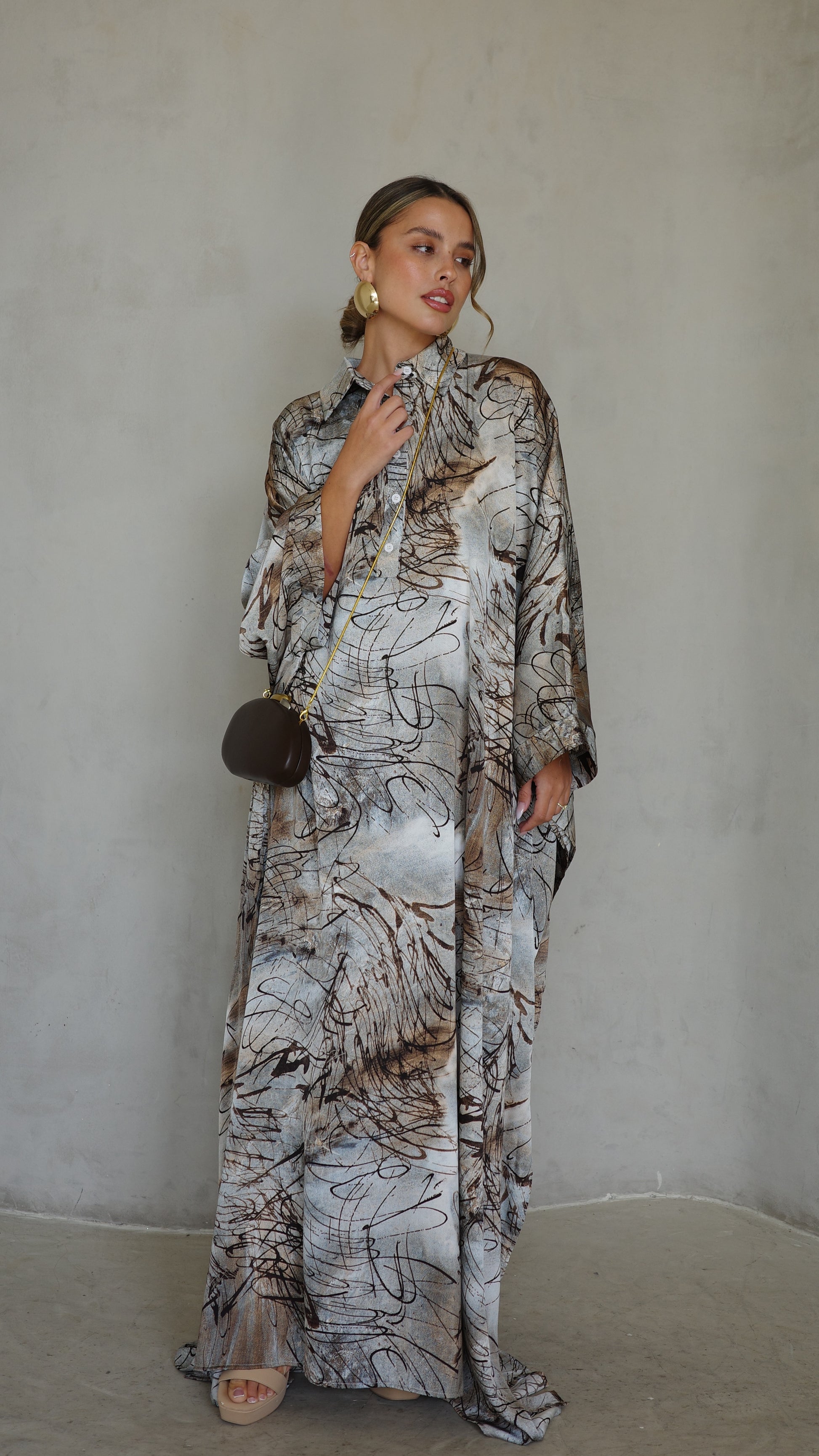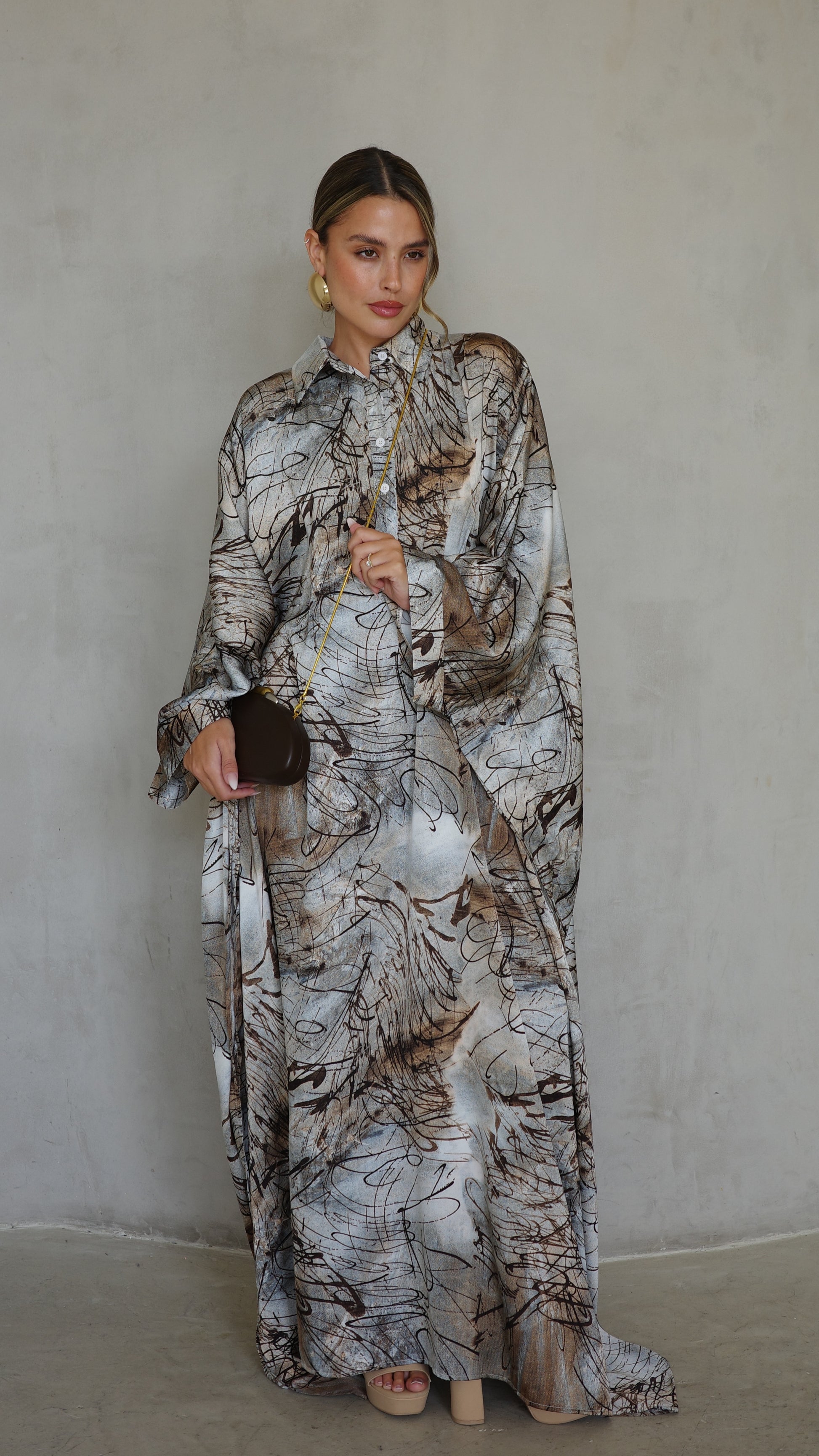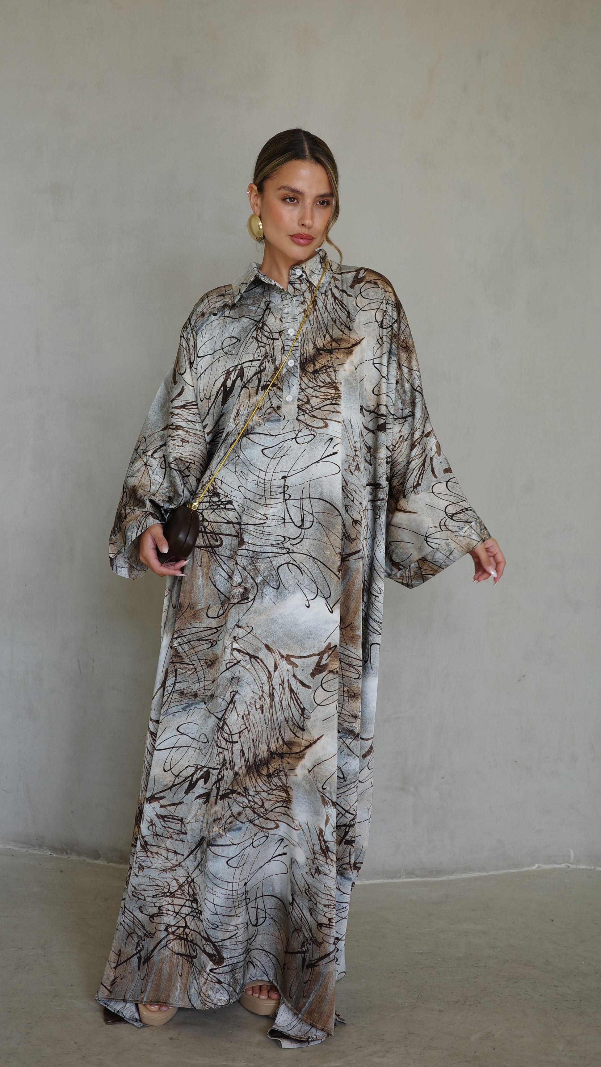 שמלת מקסי אוברסייז סאטן גולייט | בז