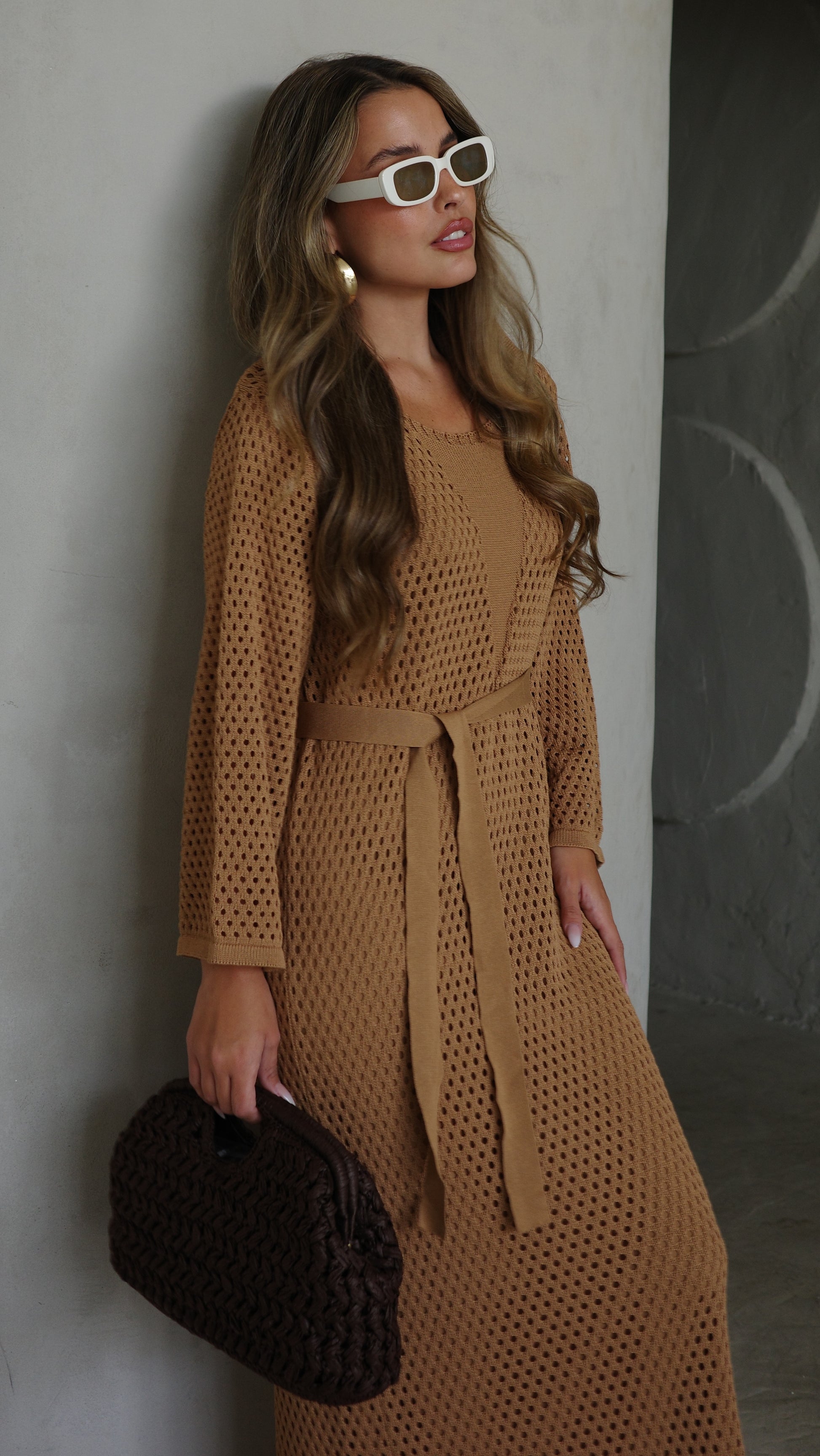 שמלת סריג 2 חלקים מחורר | קאמל