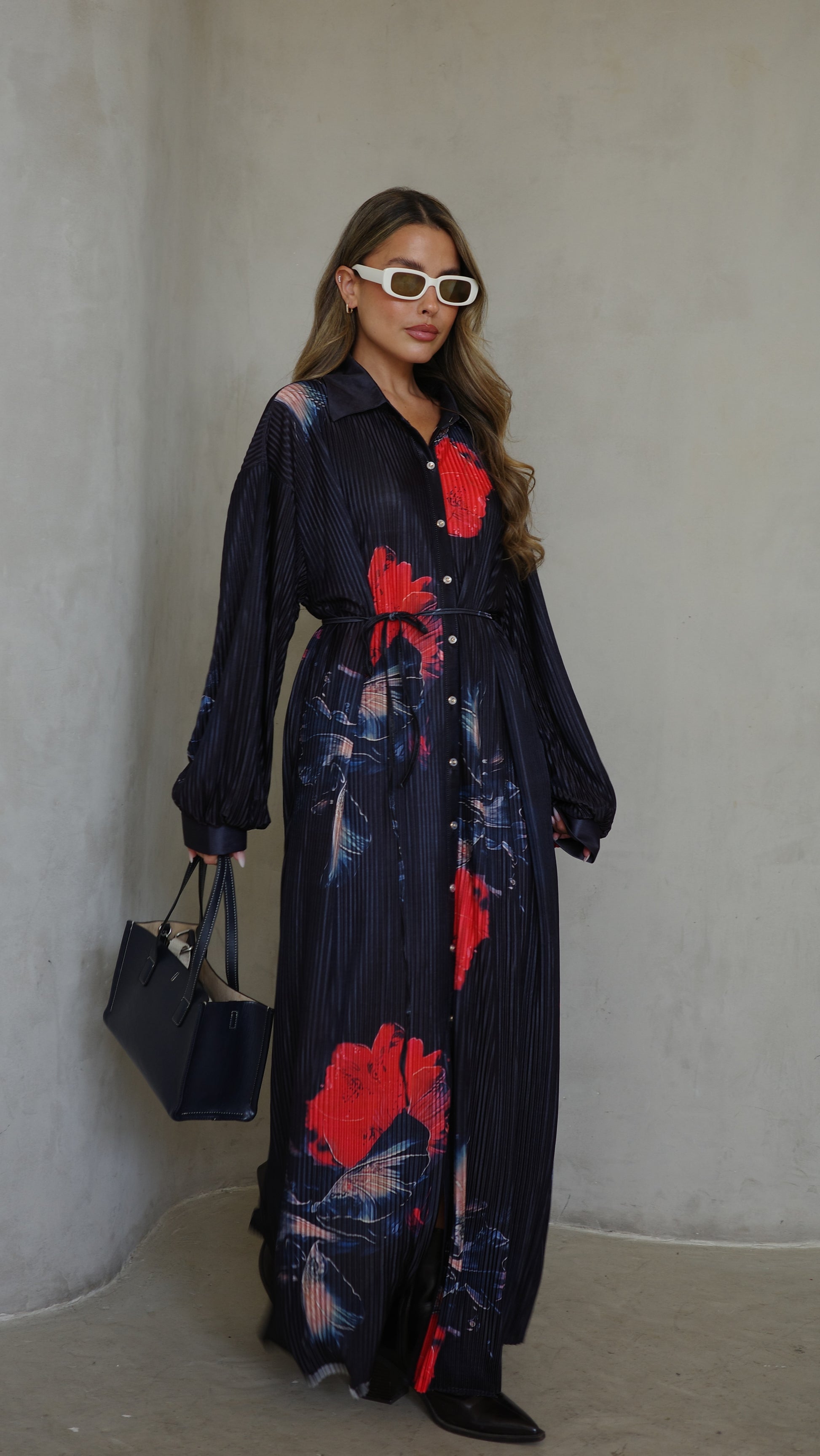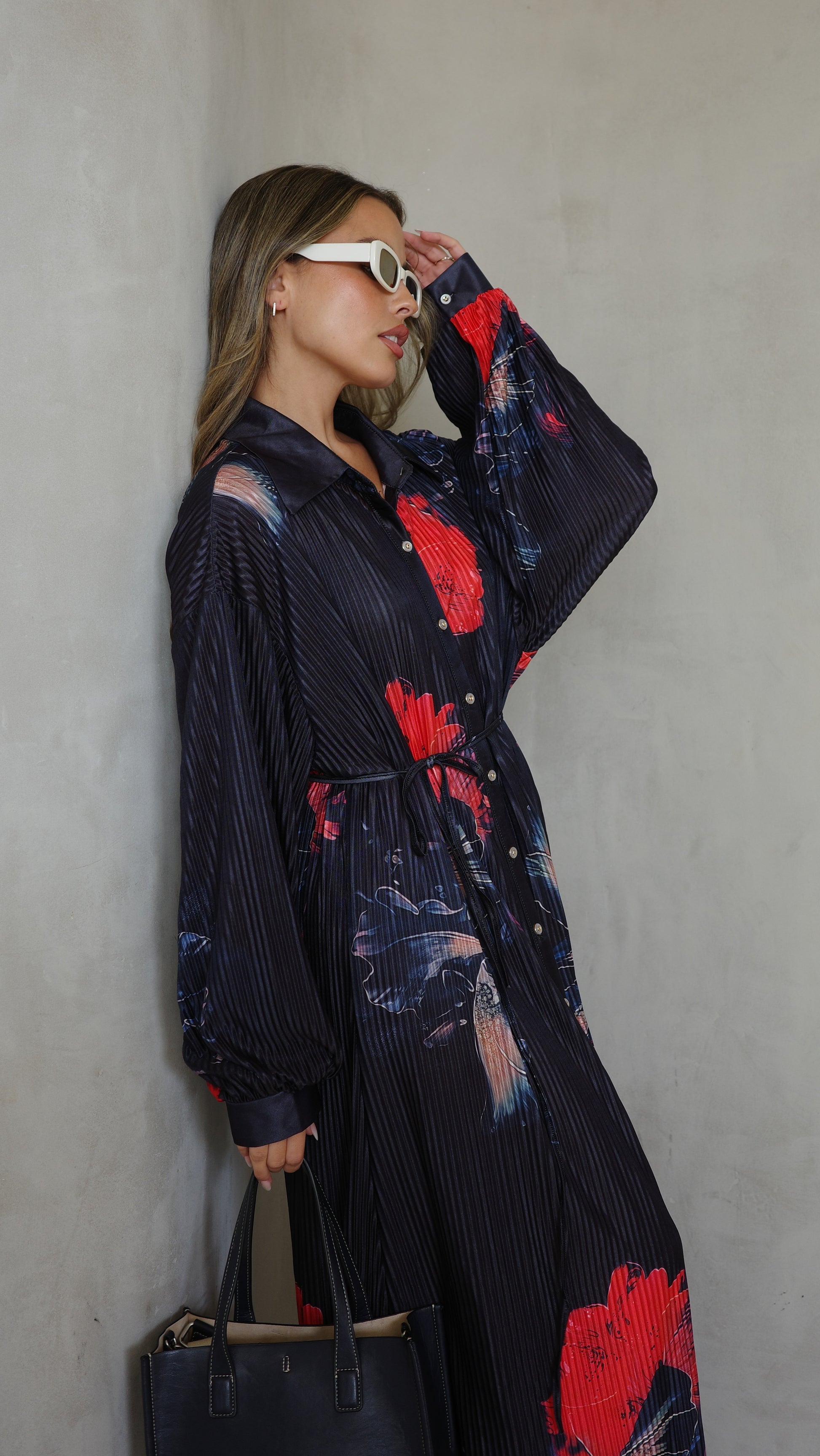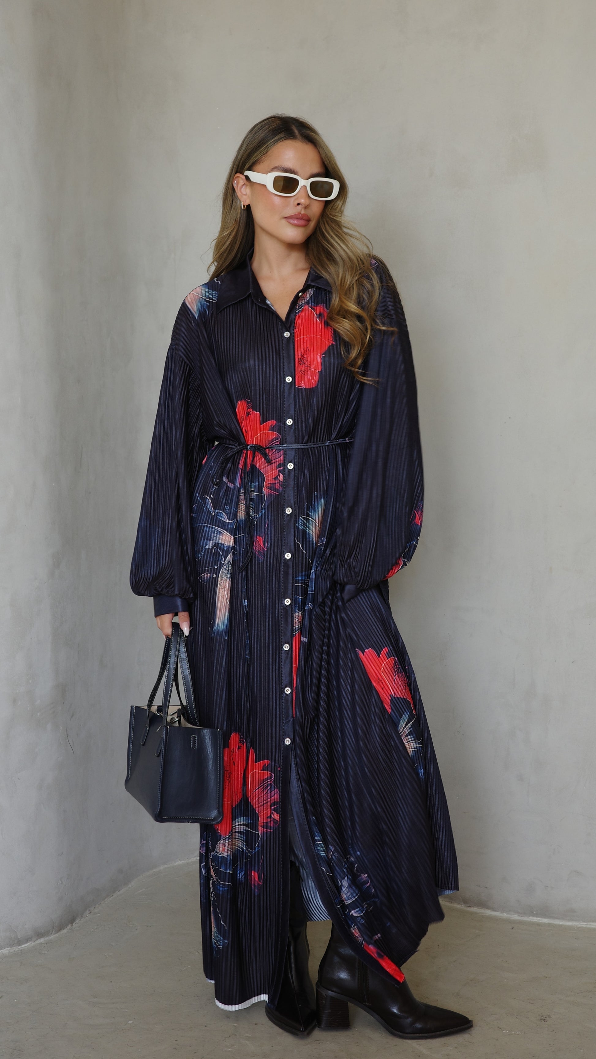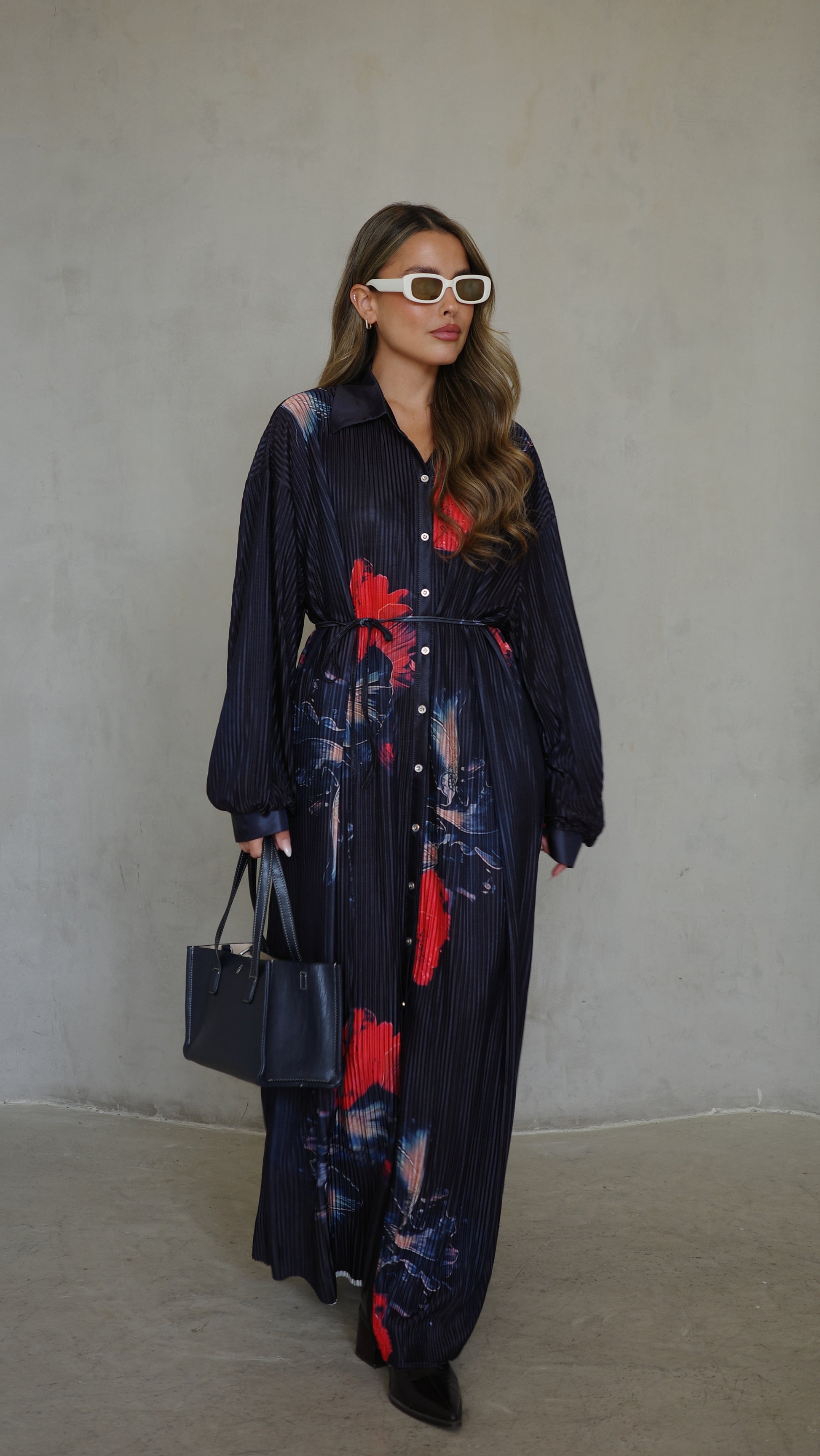שמלה בגזרת אוברסייז ישרה בטקסטורת פליסה מודפס