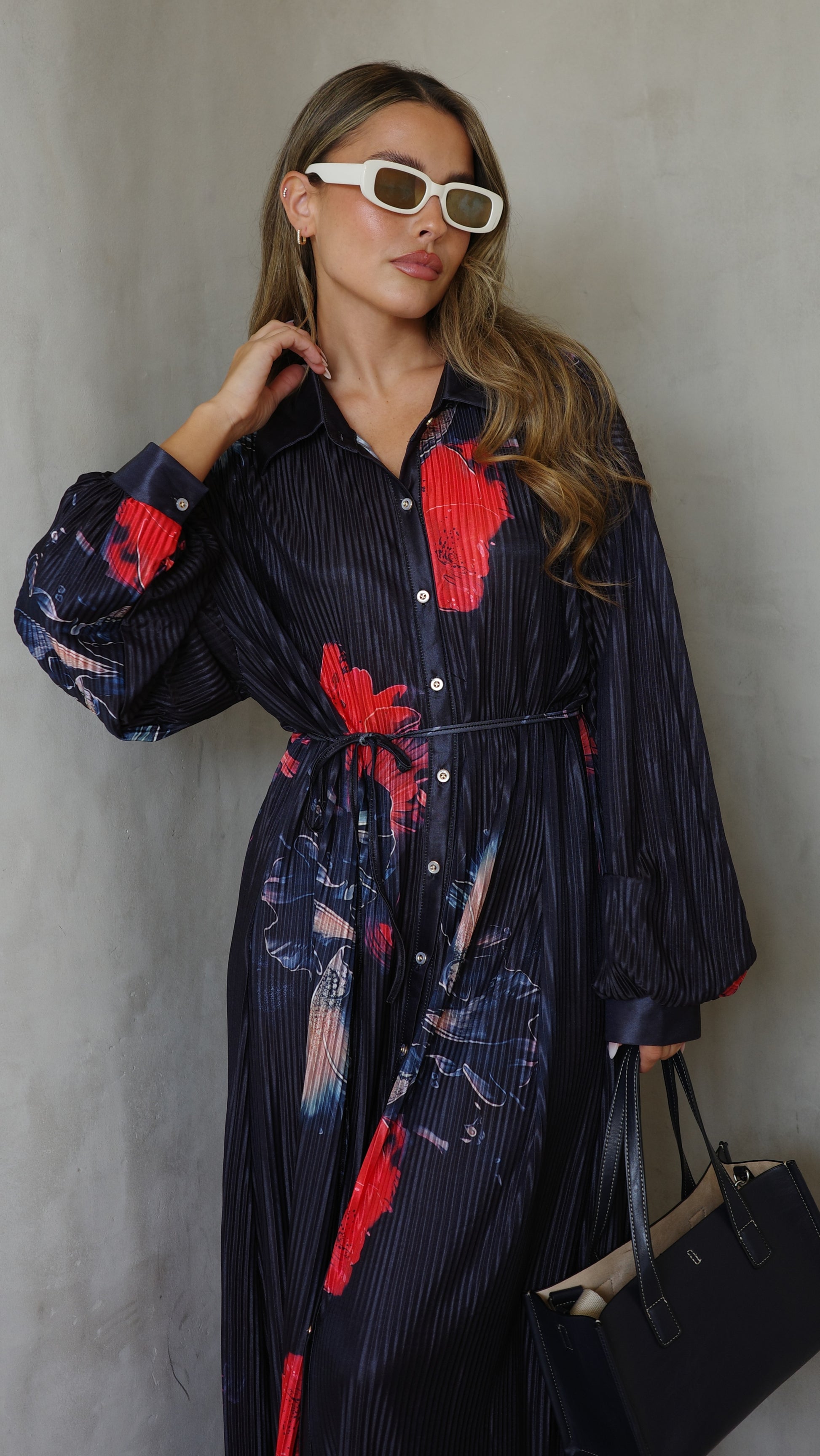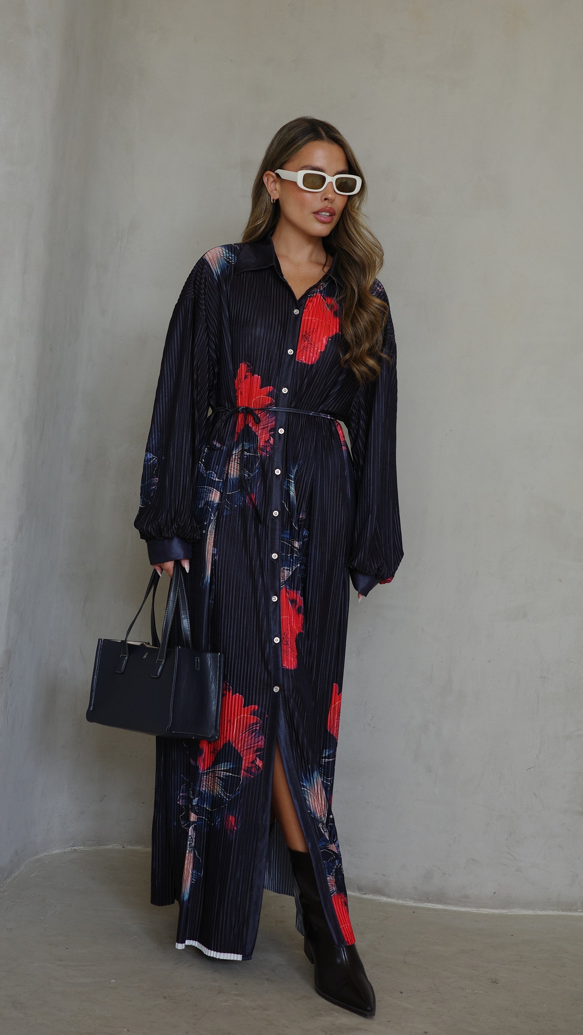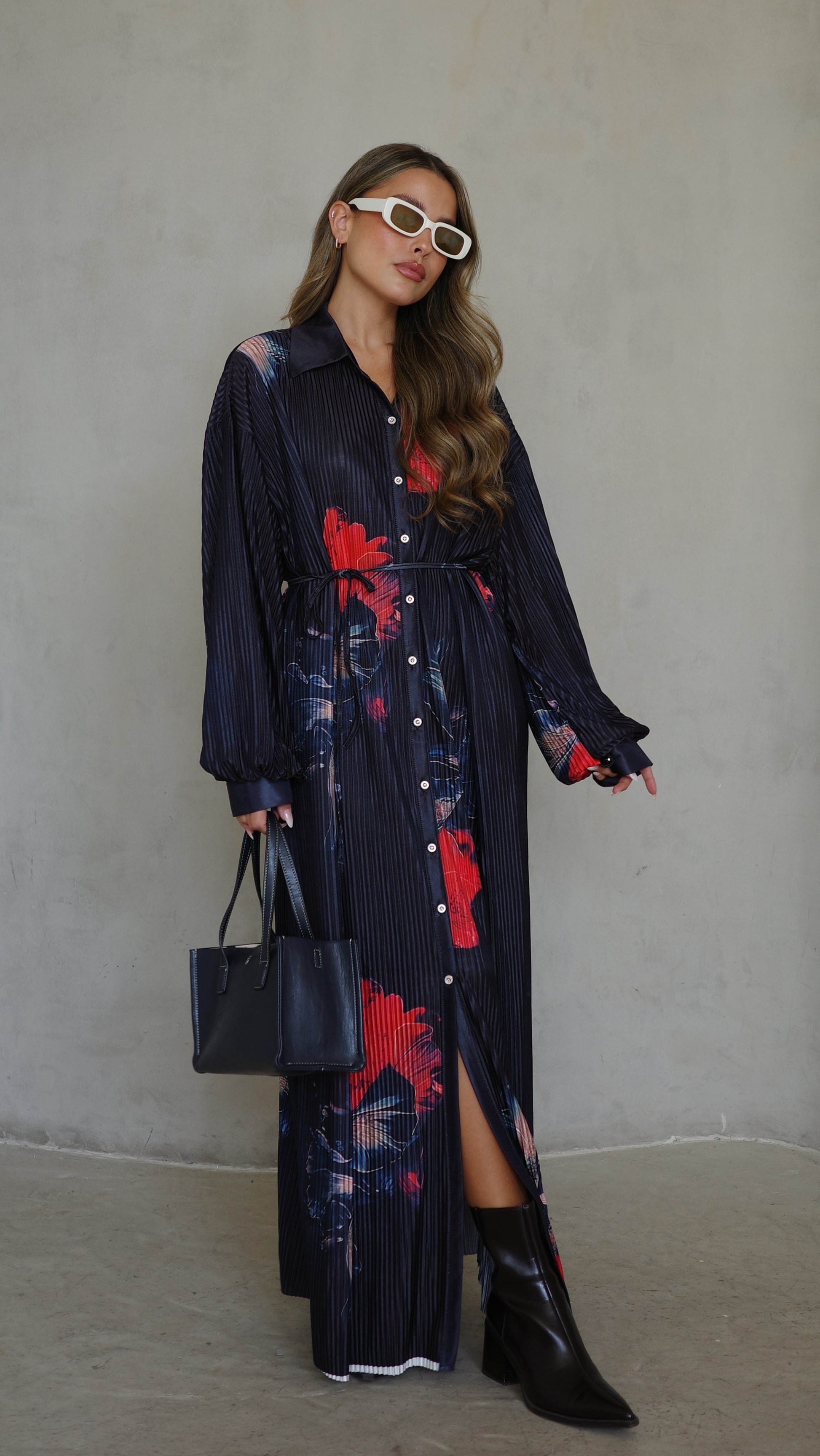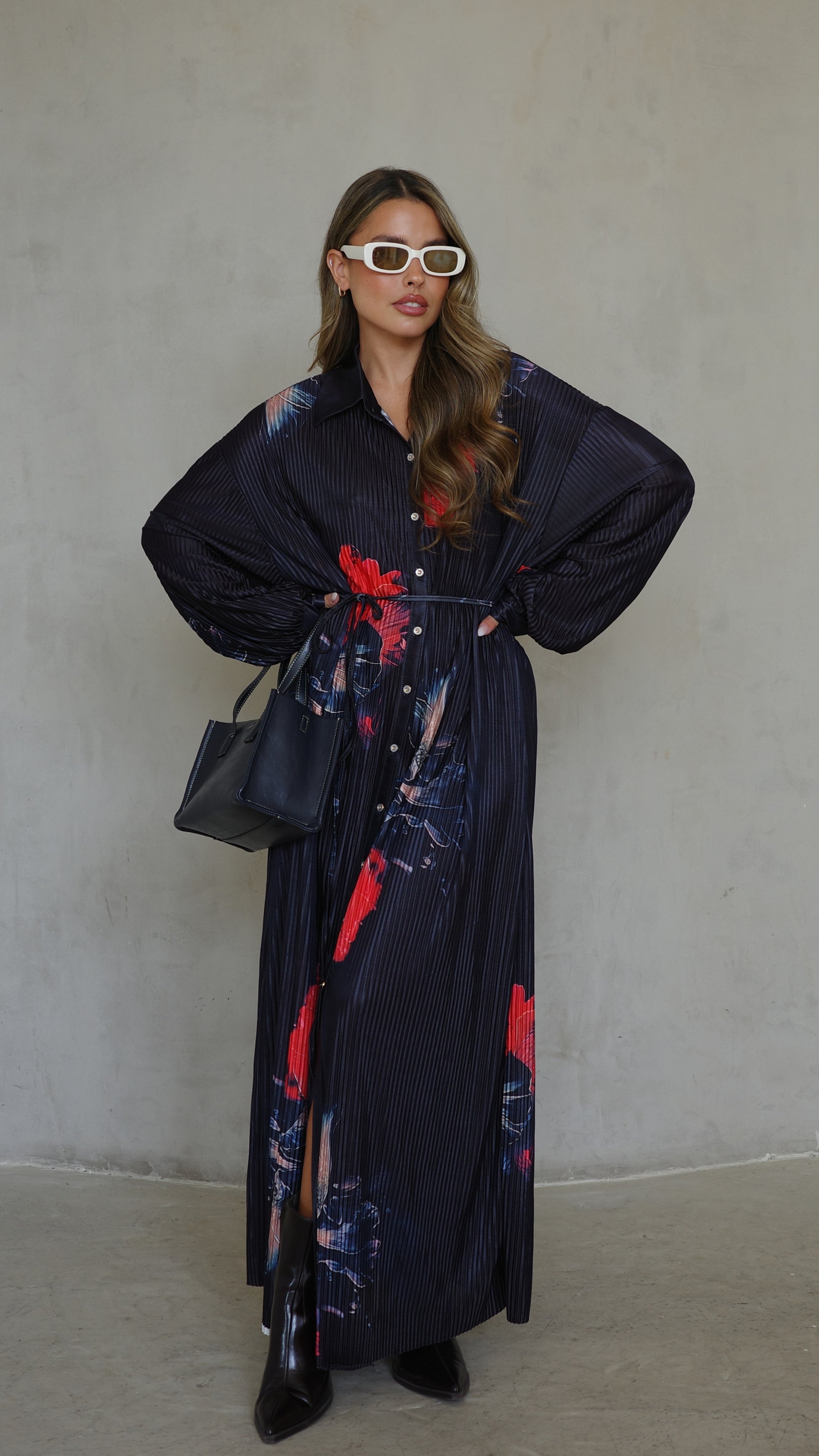 שמלה בגזרת אוברסייז ישרה בטקסטורת פליסה מודפס
