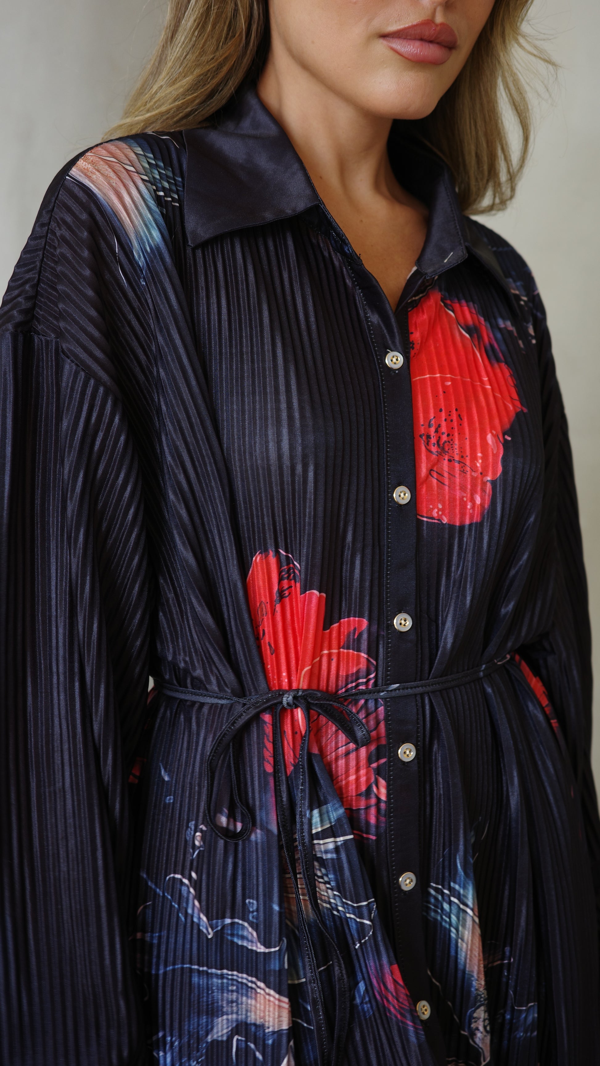 שמלה בגזרת צווארון כפתורים משולבת חגורת שרוך