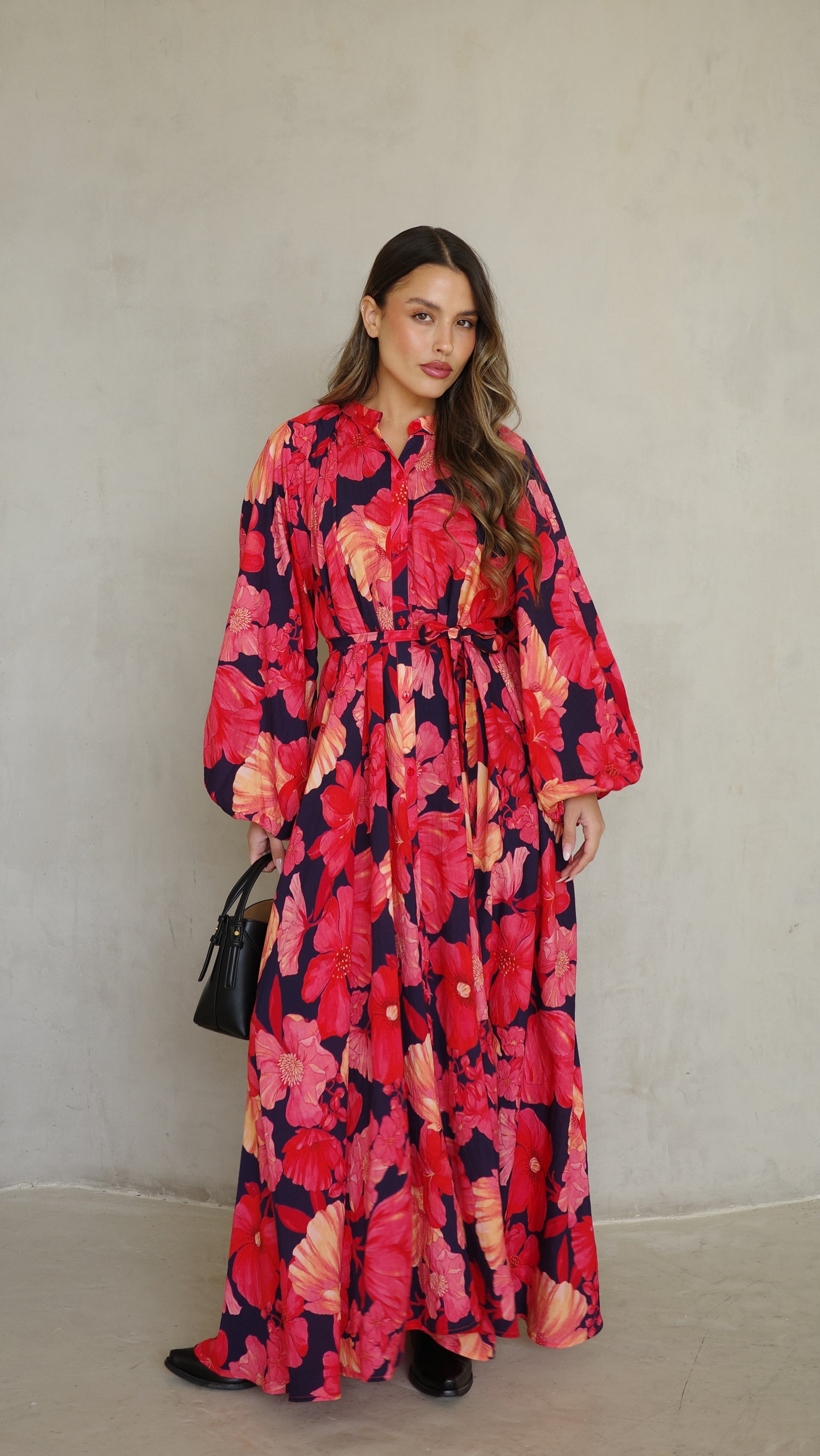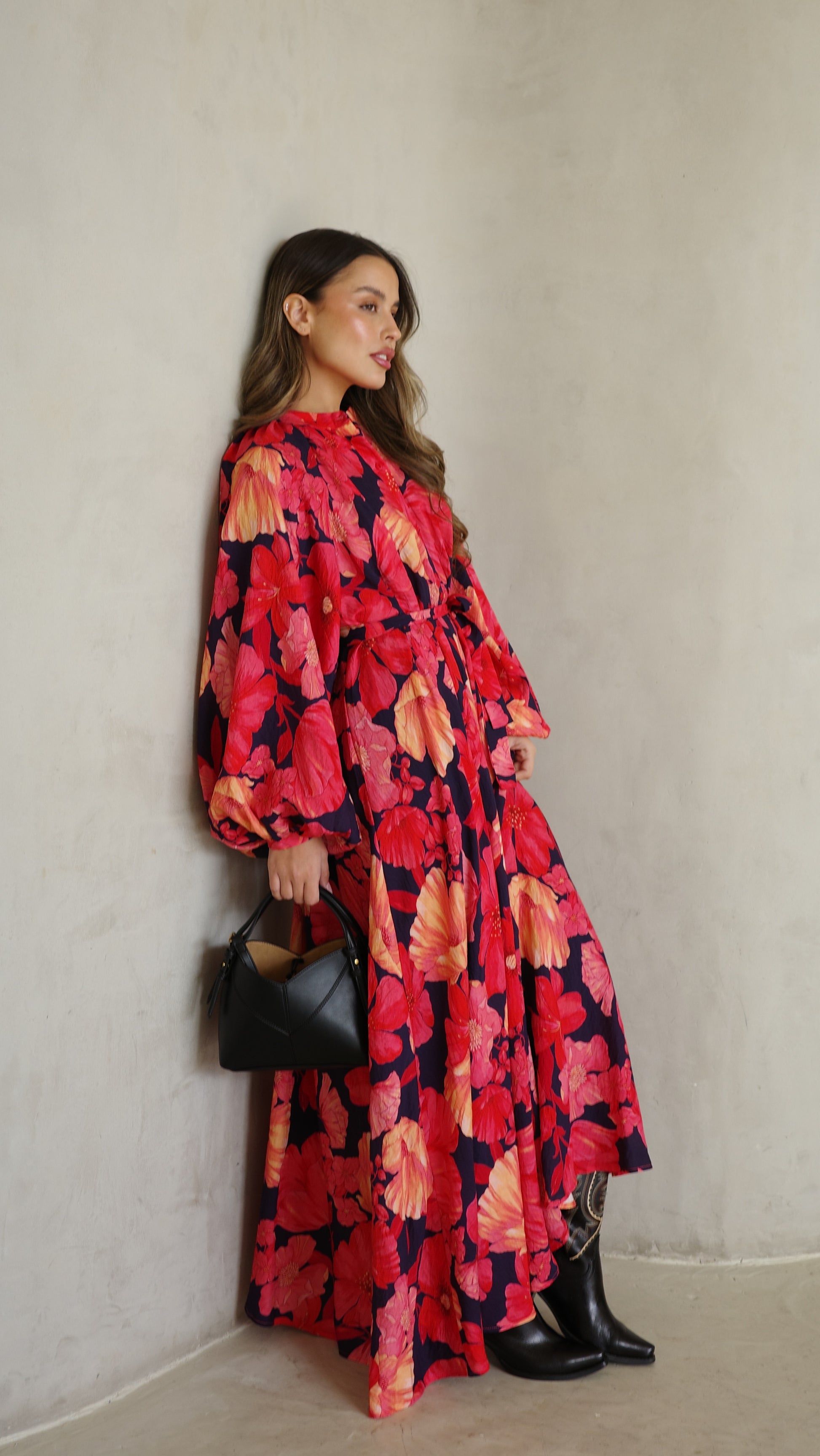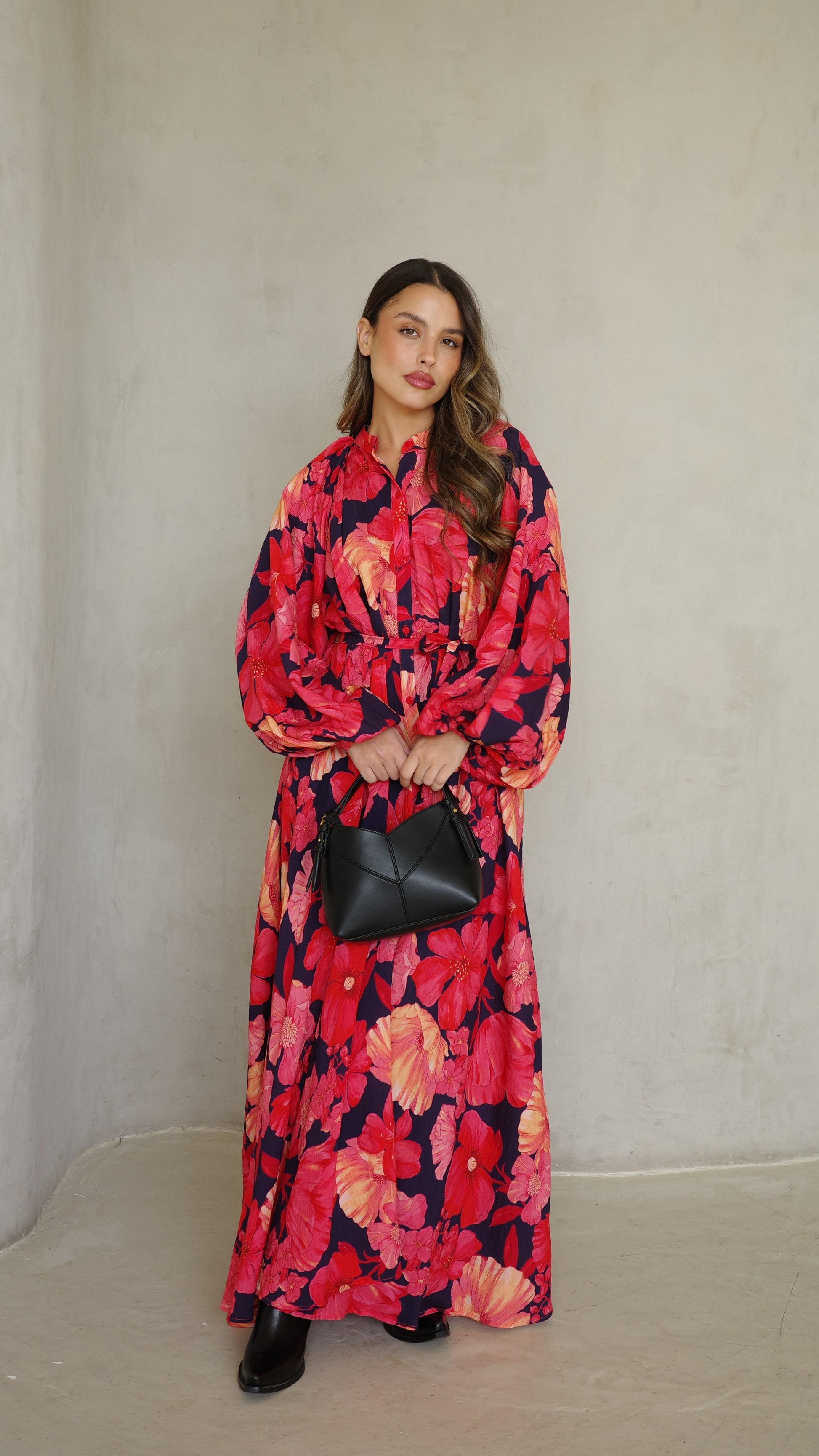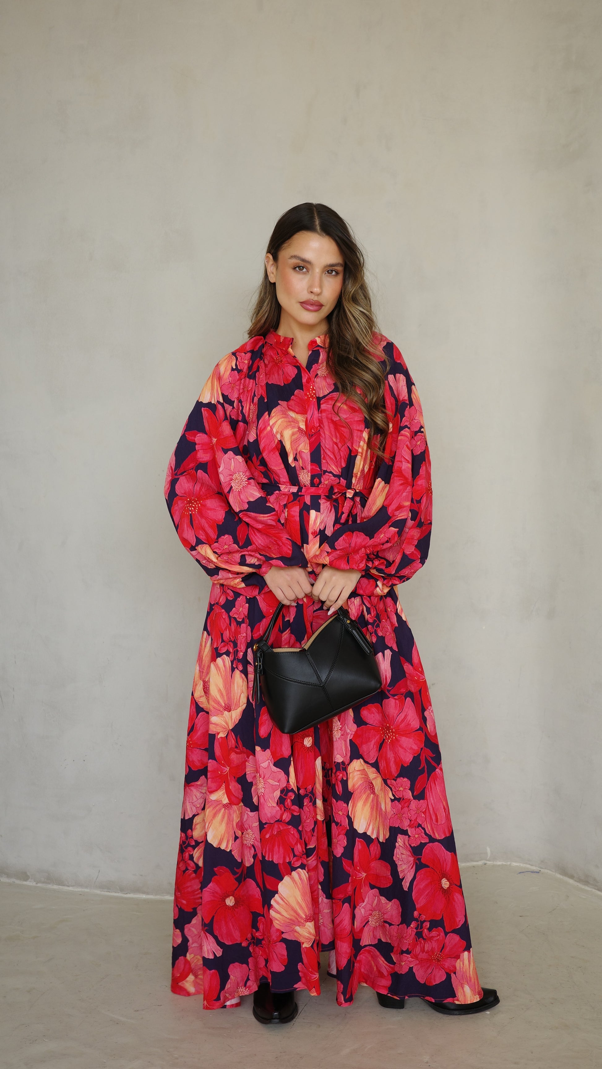 שמלה בגזרה רחבה במיוחד, בד נשפך ושרוול נפוח משולב כיווצים בסיומת מנג'ט 1 ס"מ