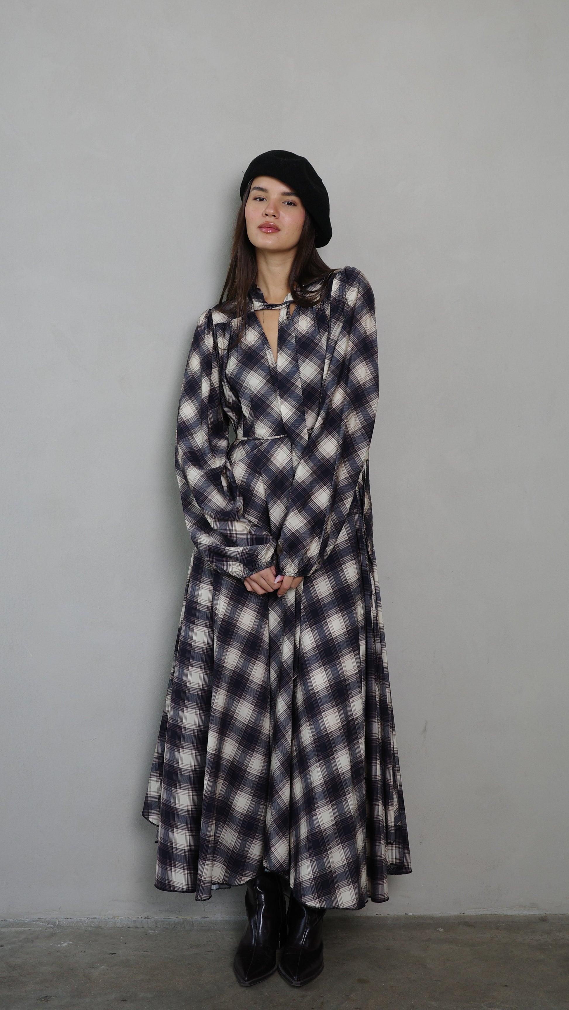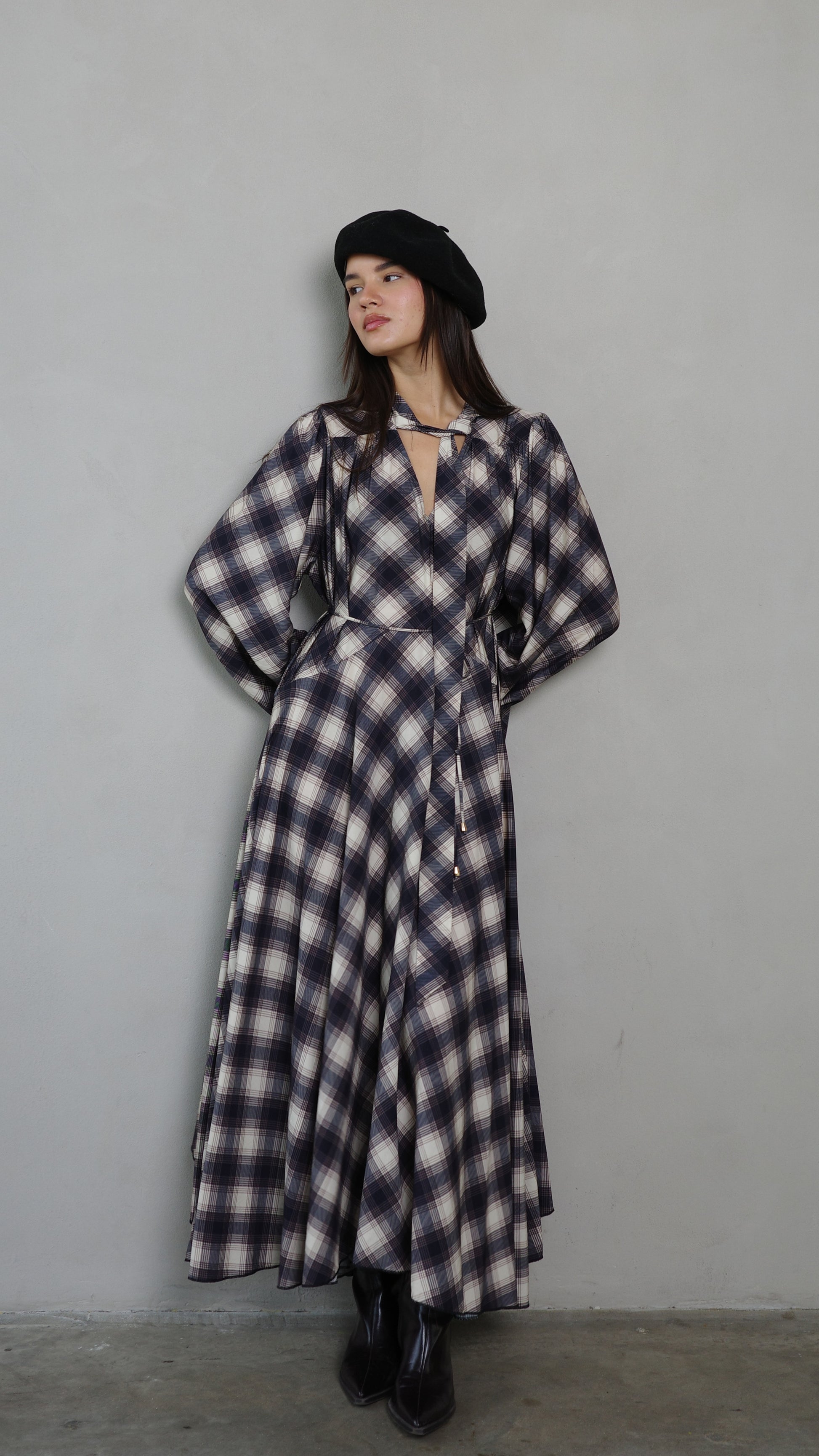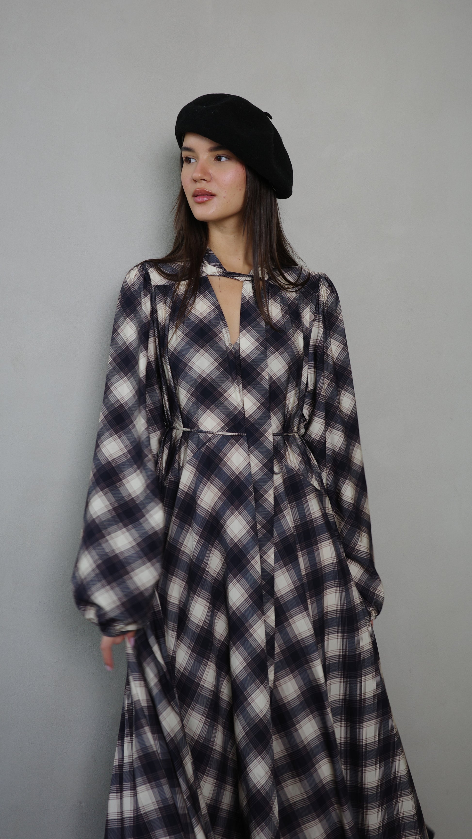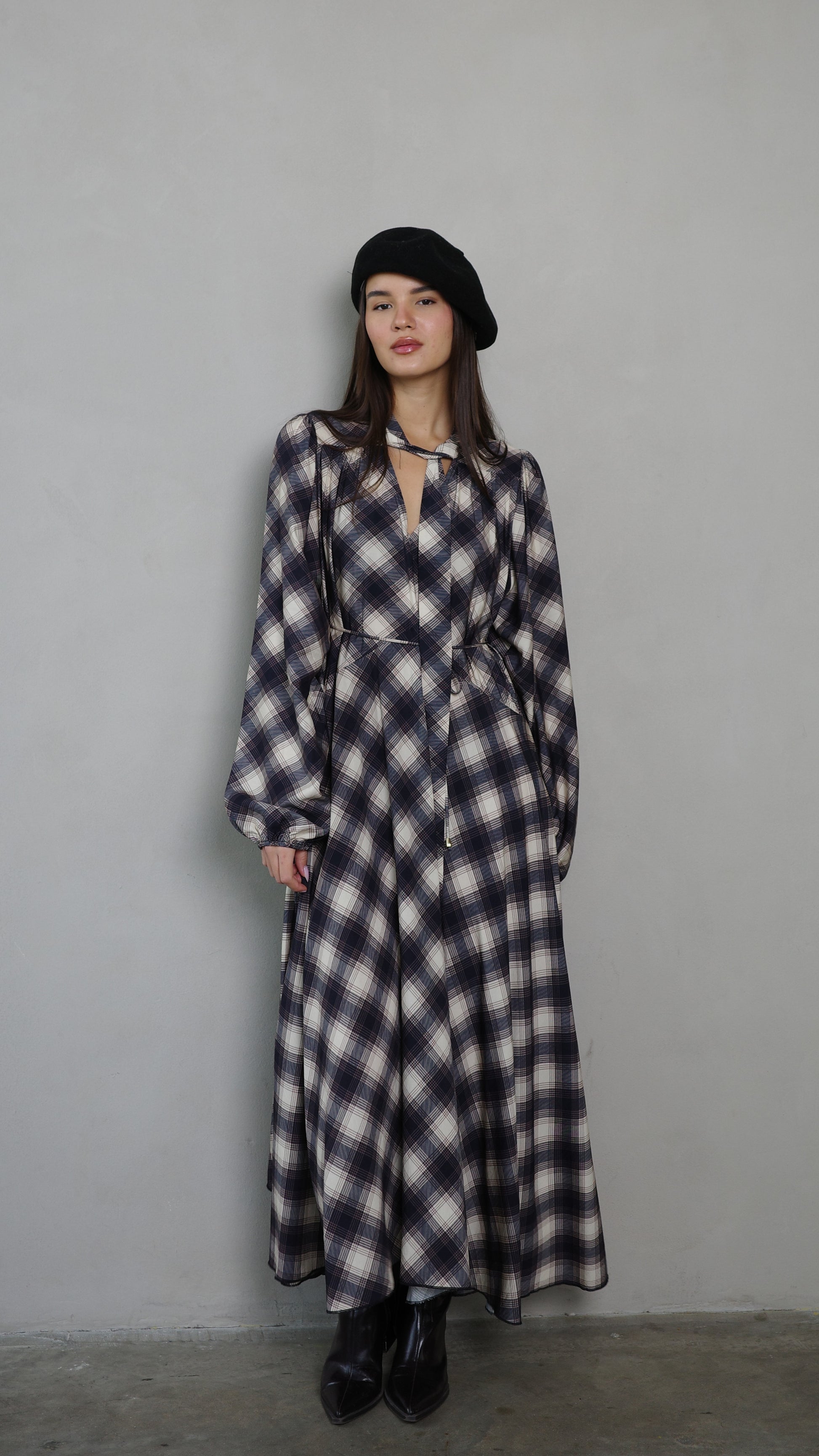 שמלת קלוש עניבה קארינה משבצות | בז/אפור