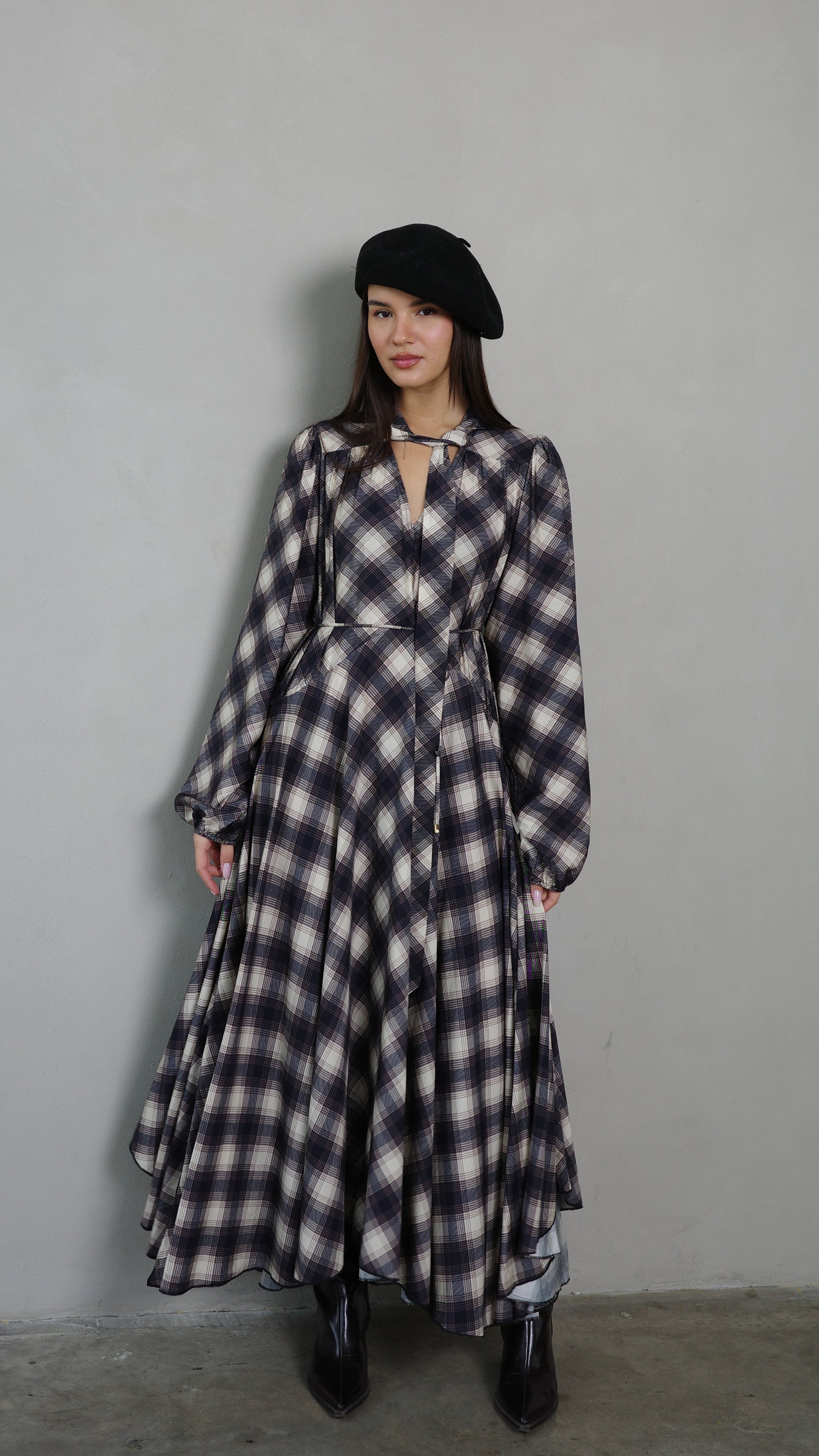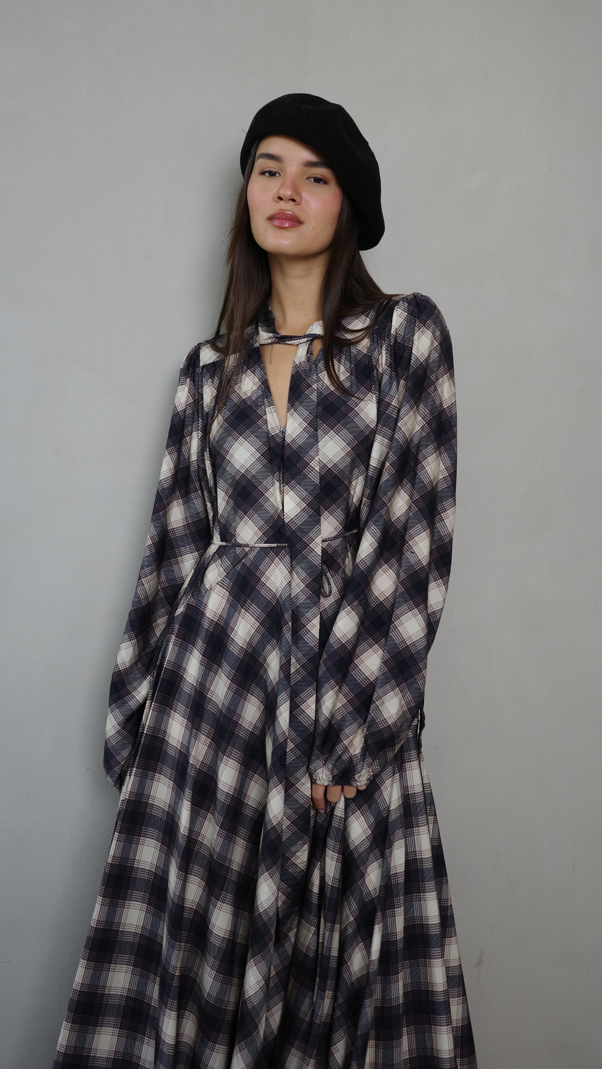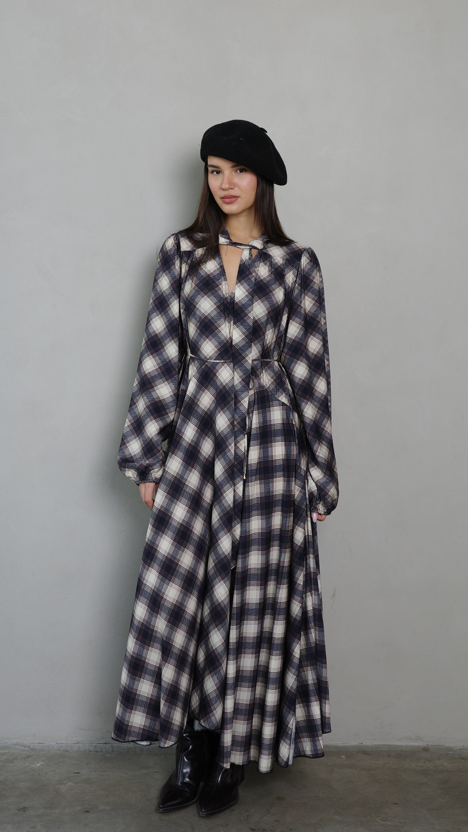 שמלת קלוש עניבה קארינה משבצות | בז/אפור