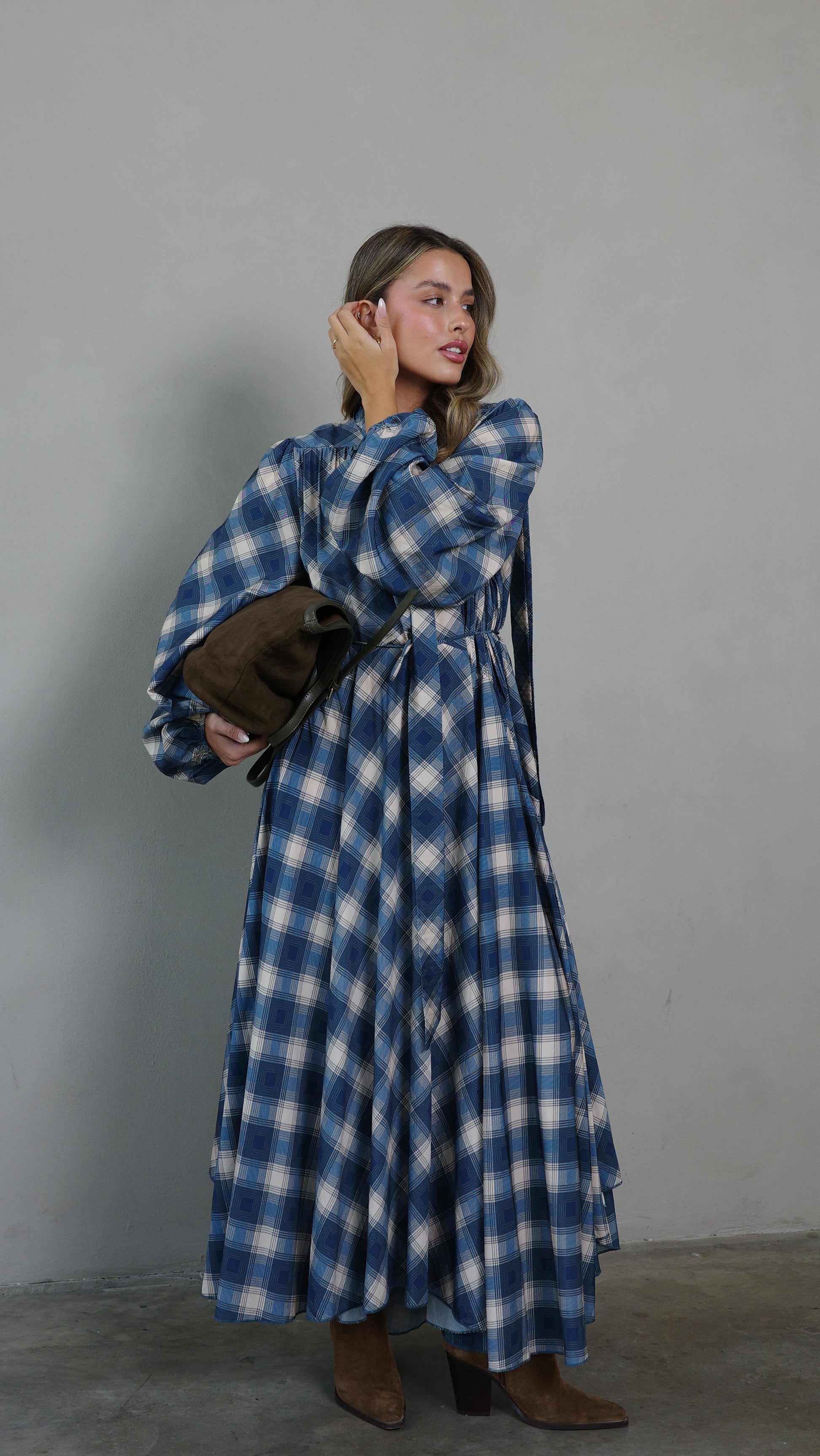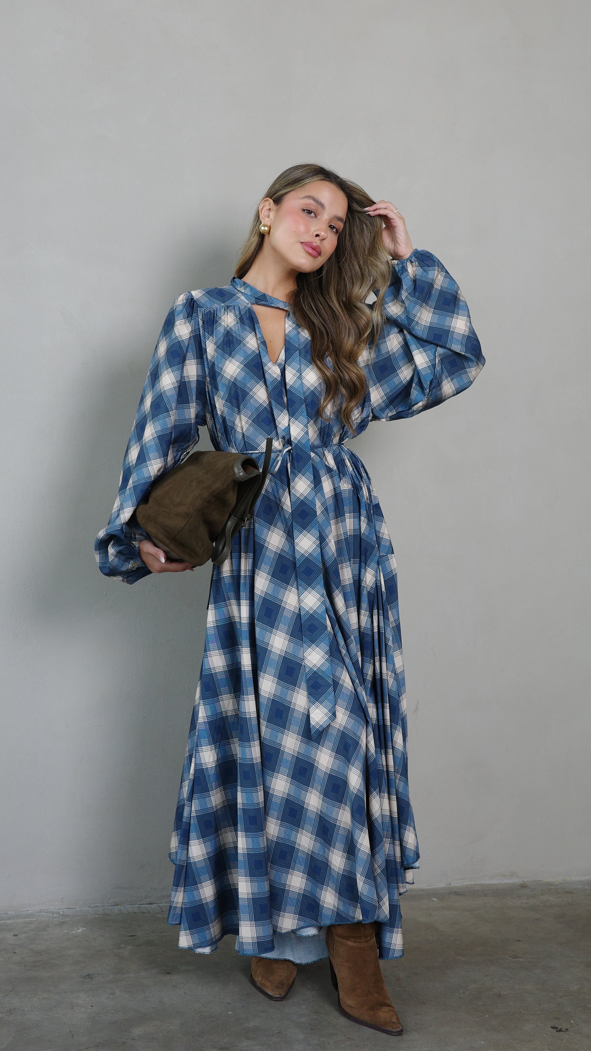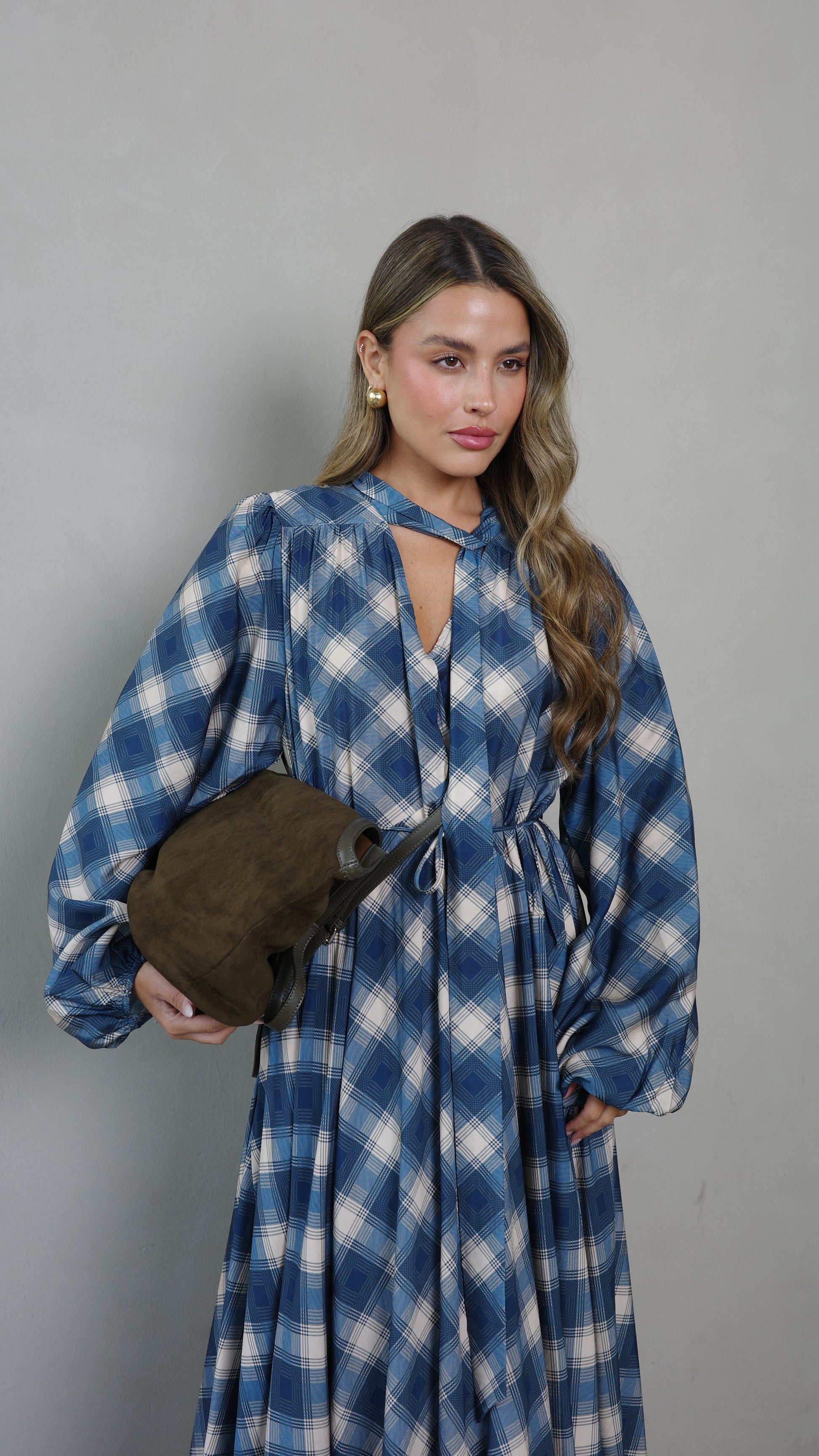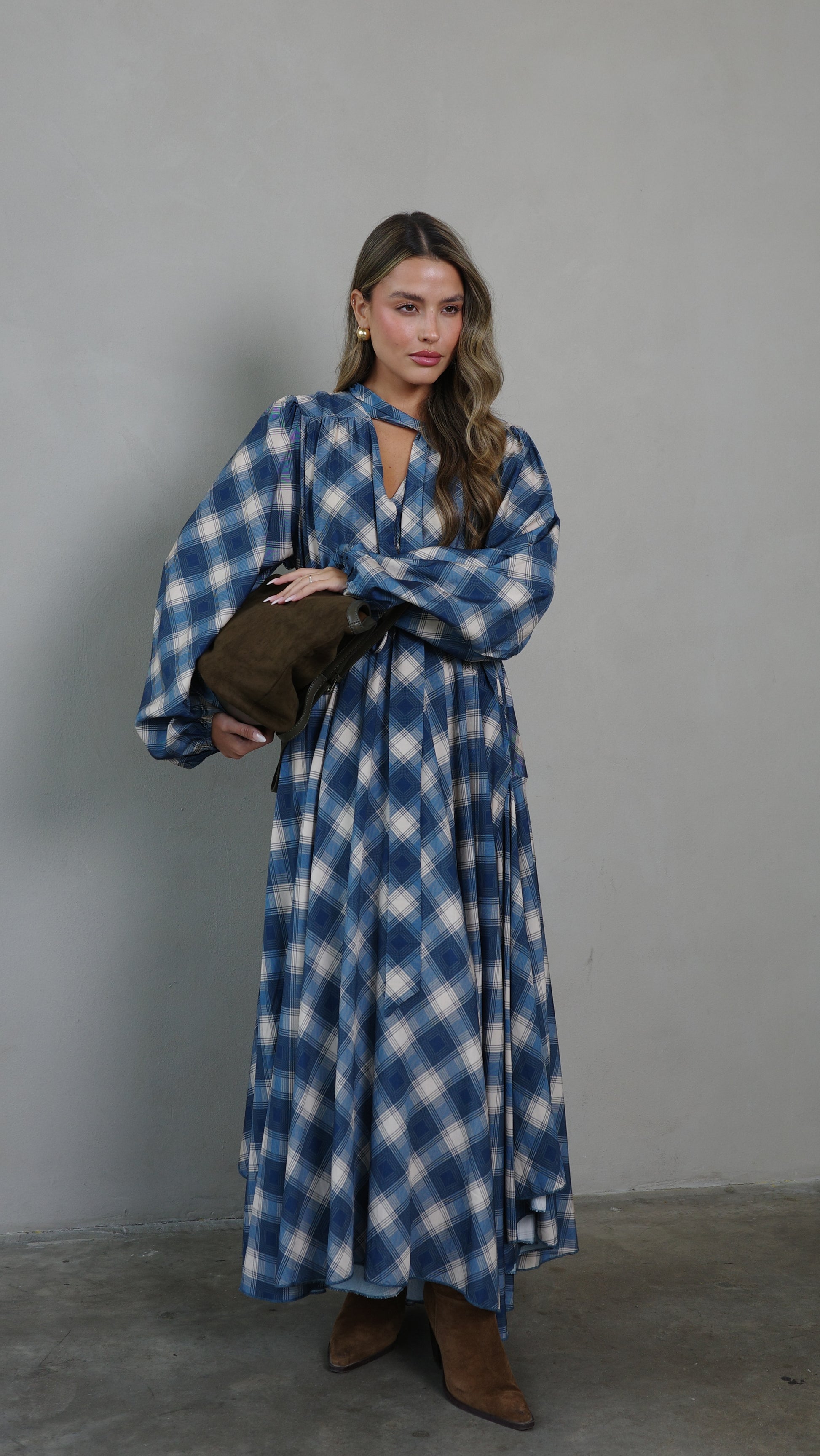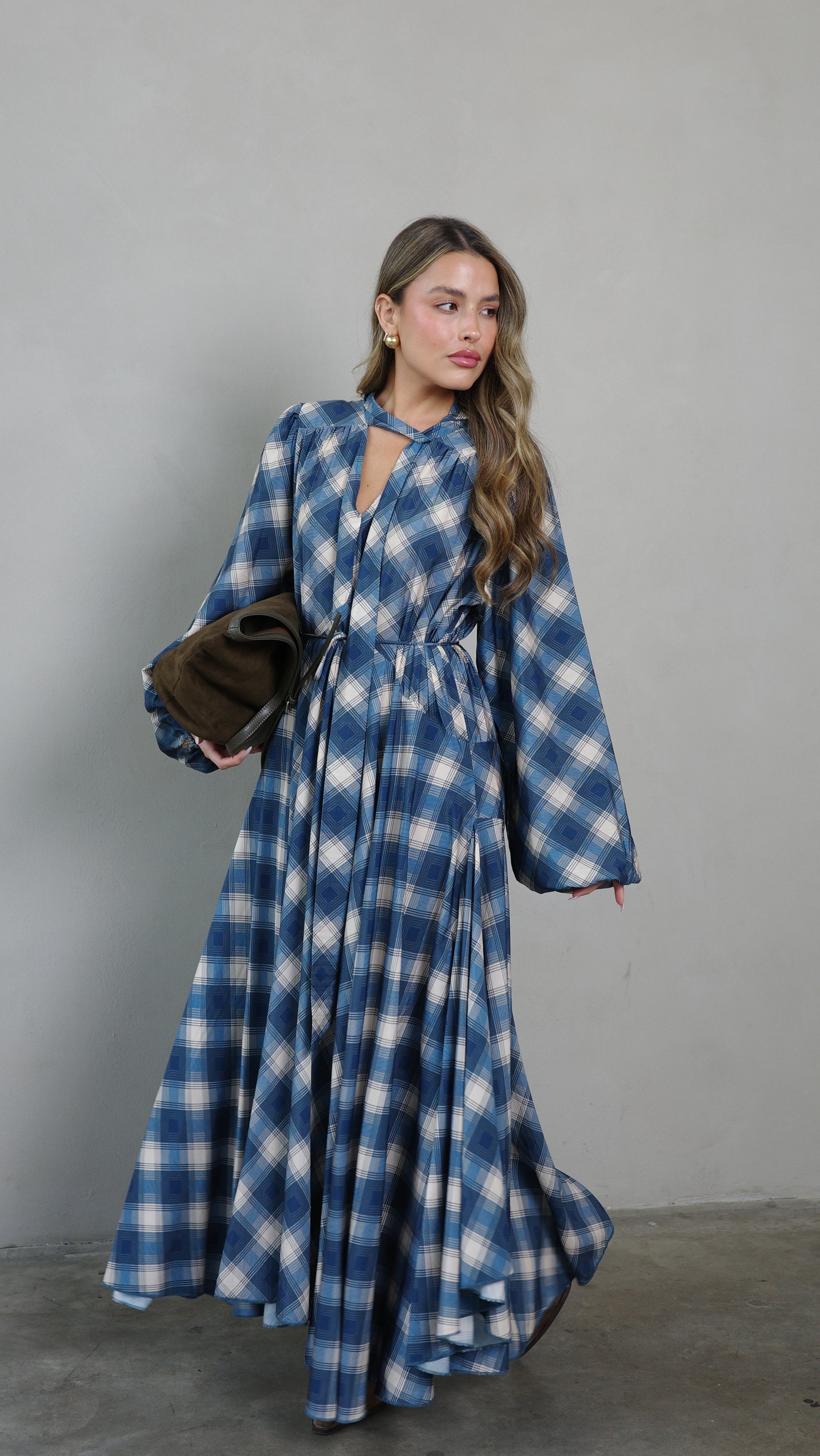שמלת קלוש עניבה קארינה משבצות | בז/כחול