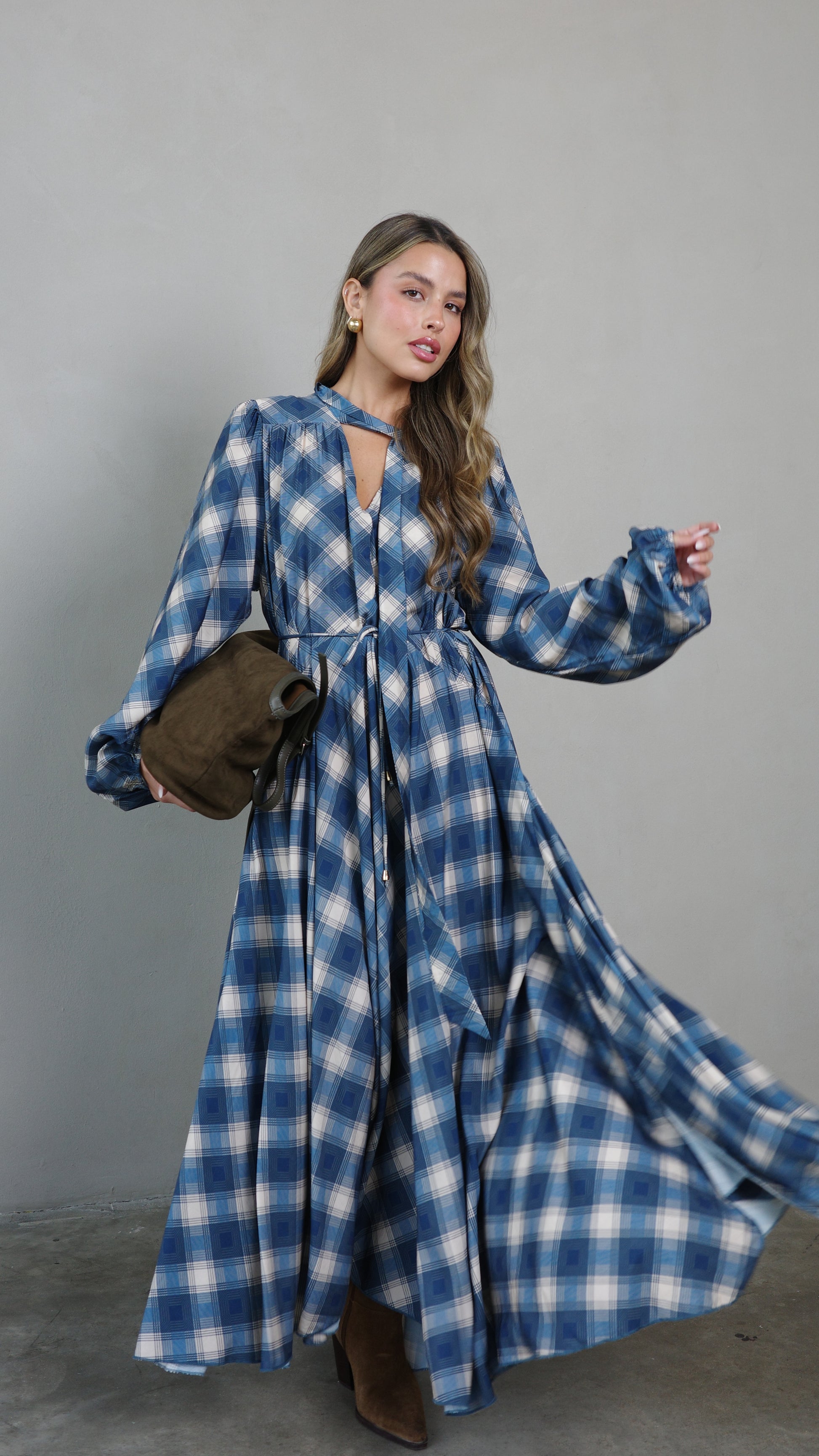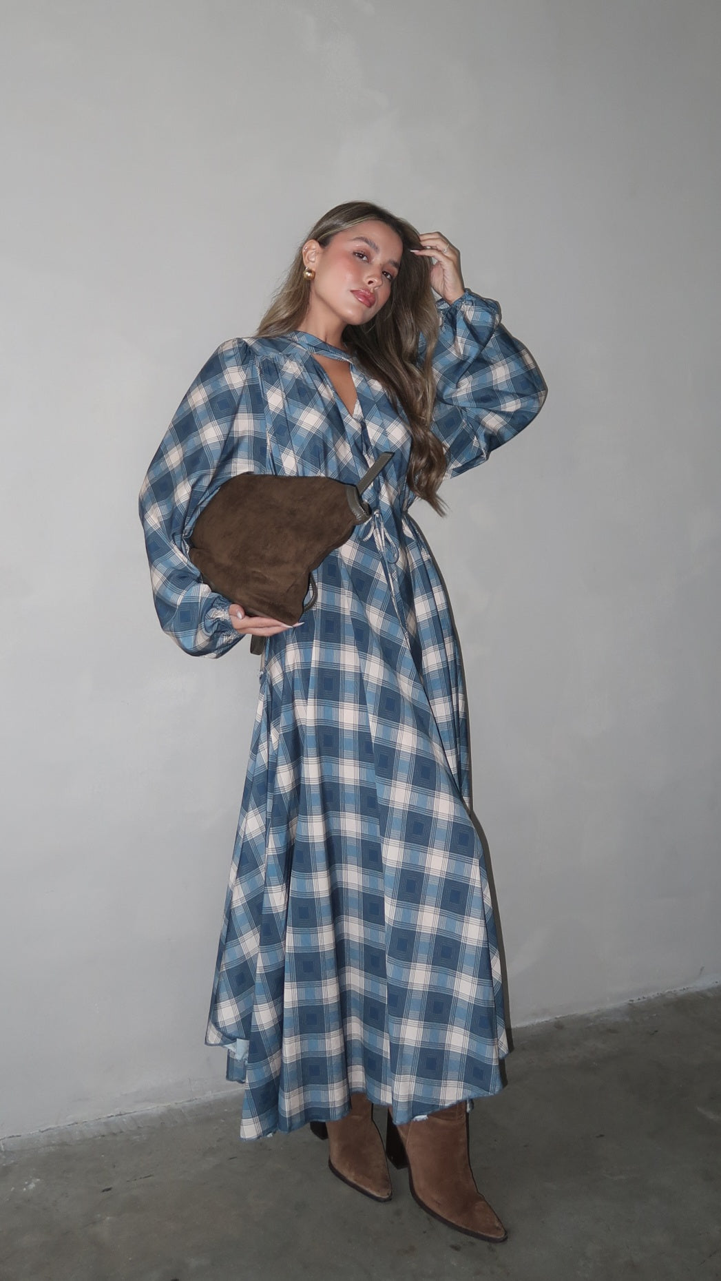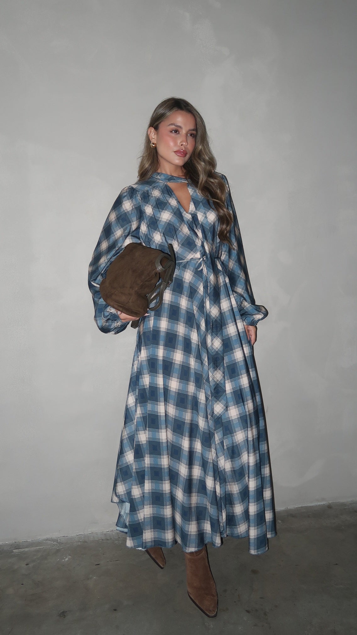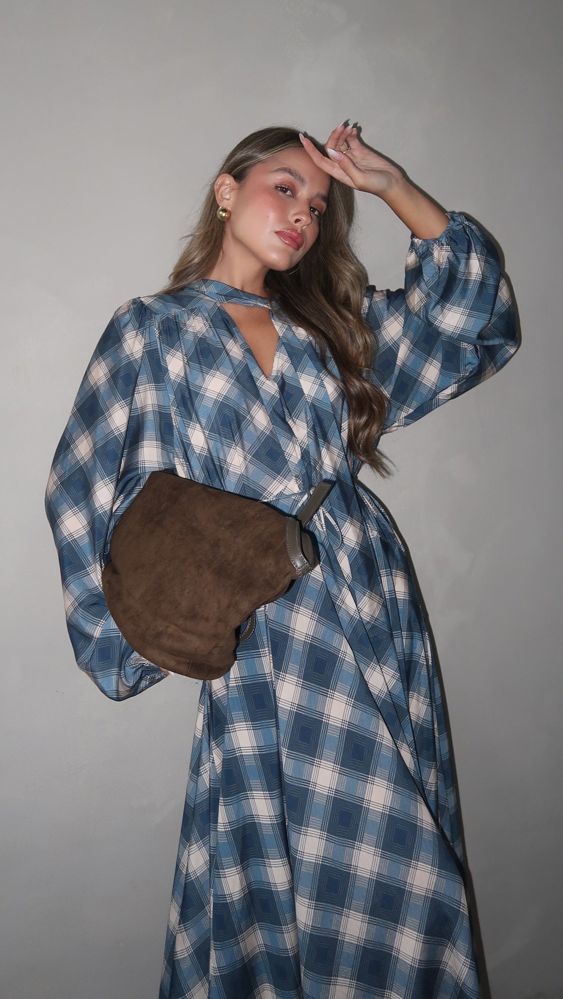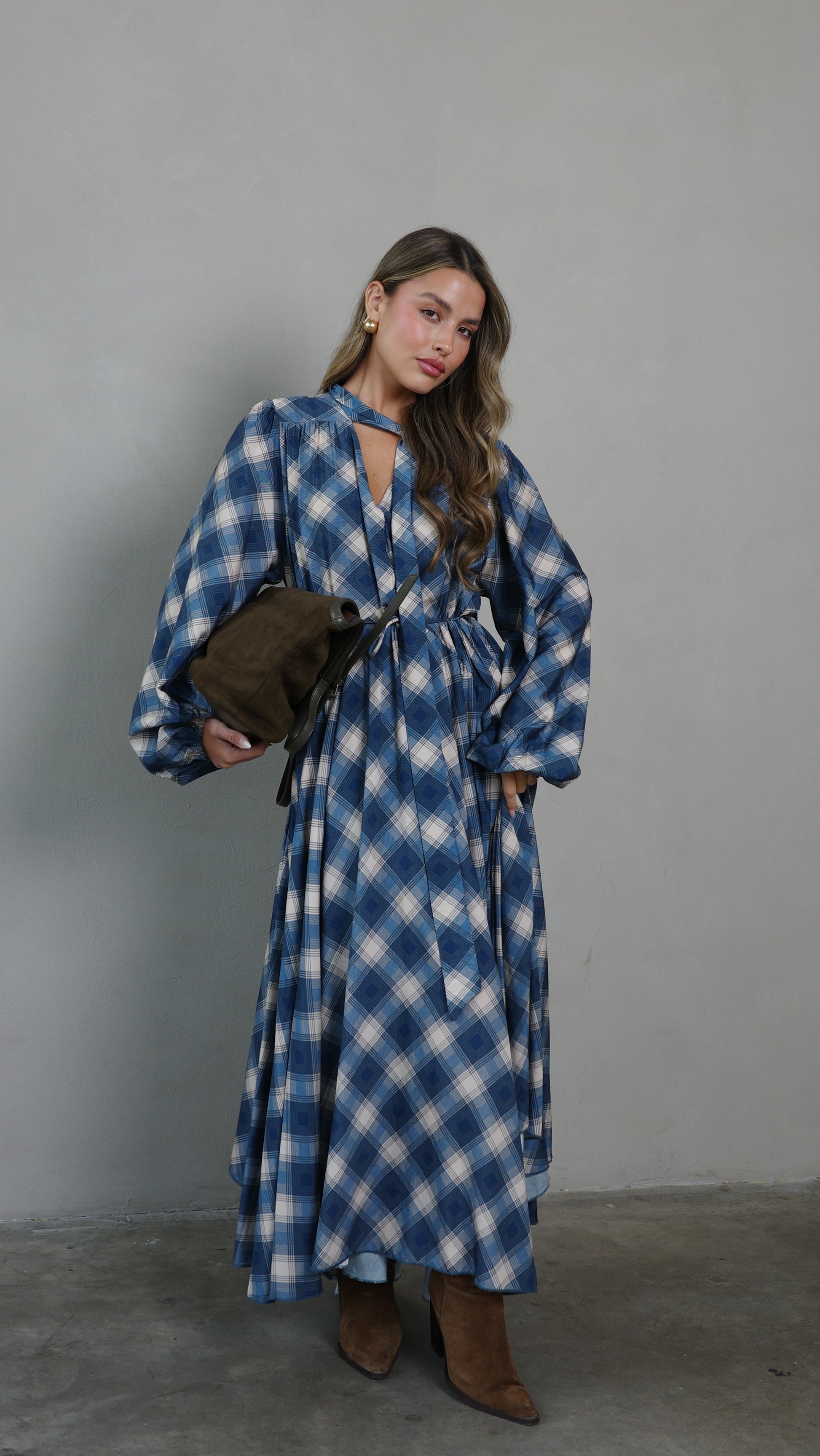 שמלת קלוש עניבה קארינה משבצות | בז/כחול