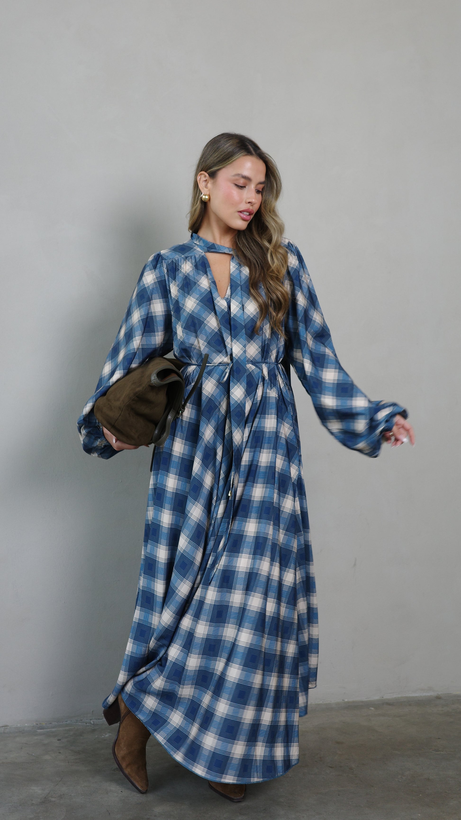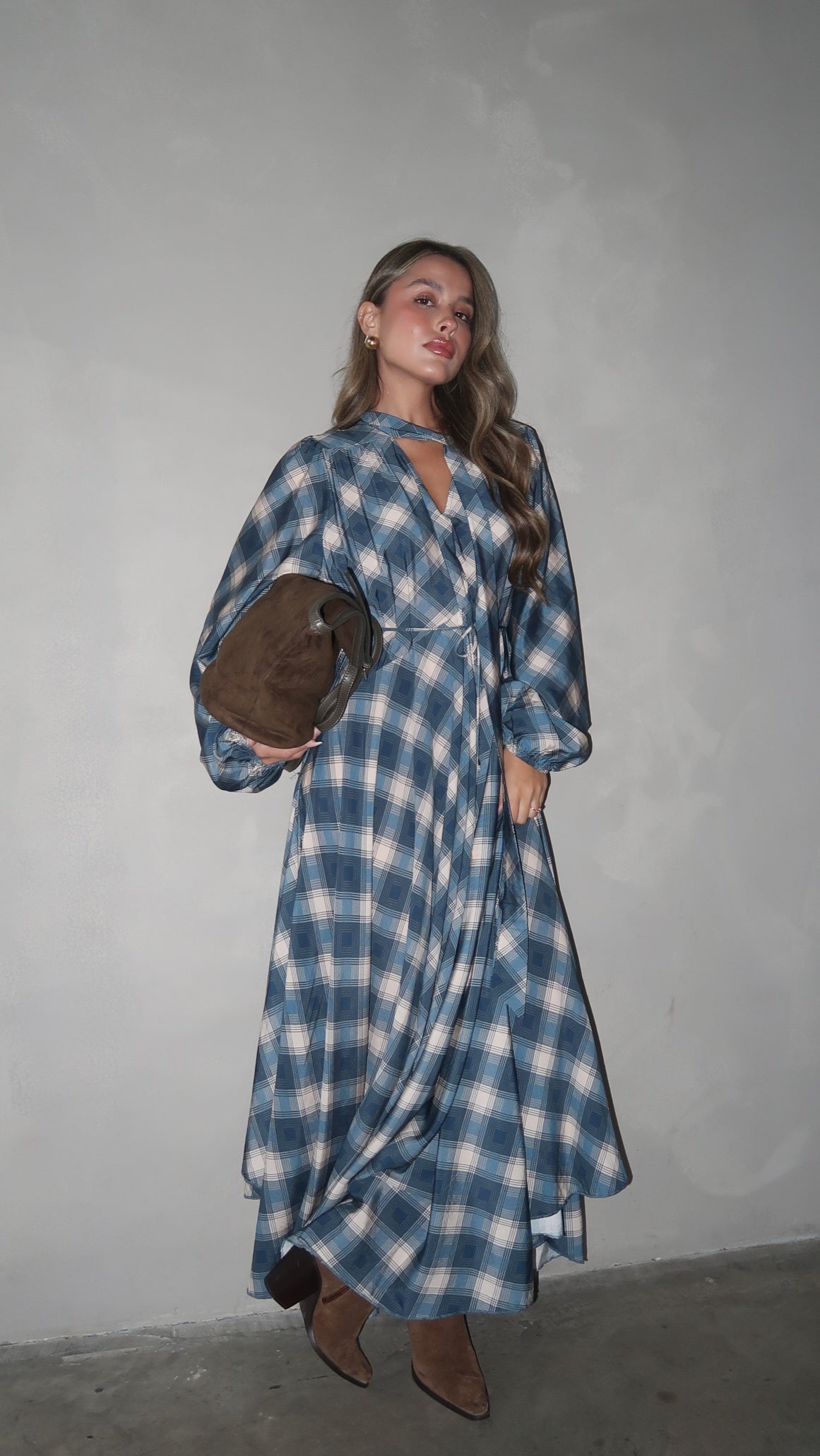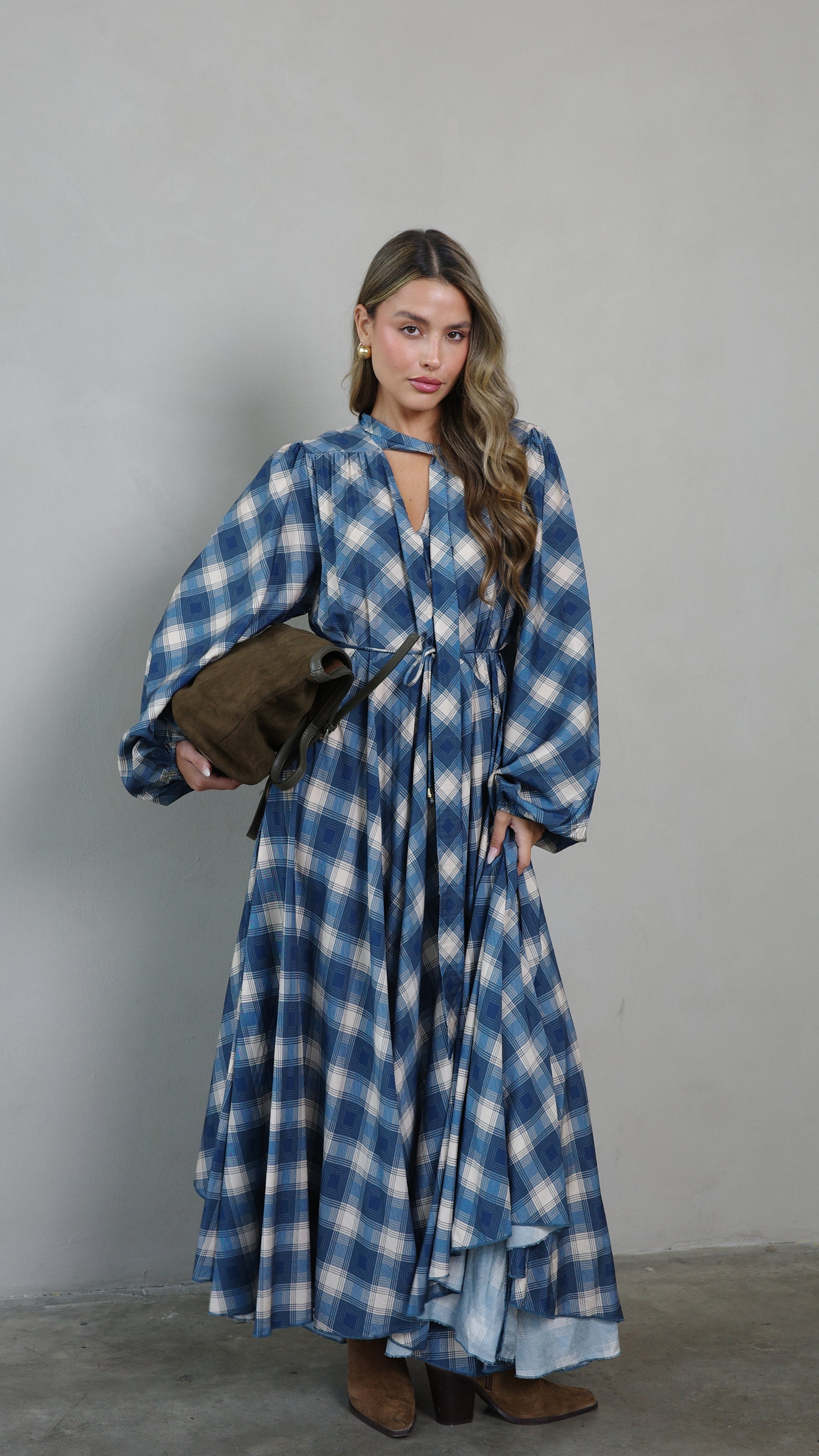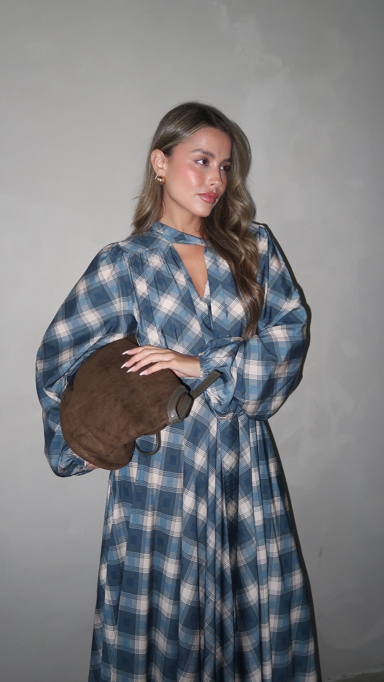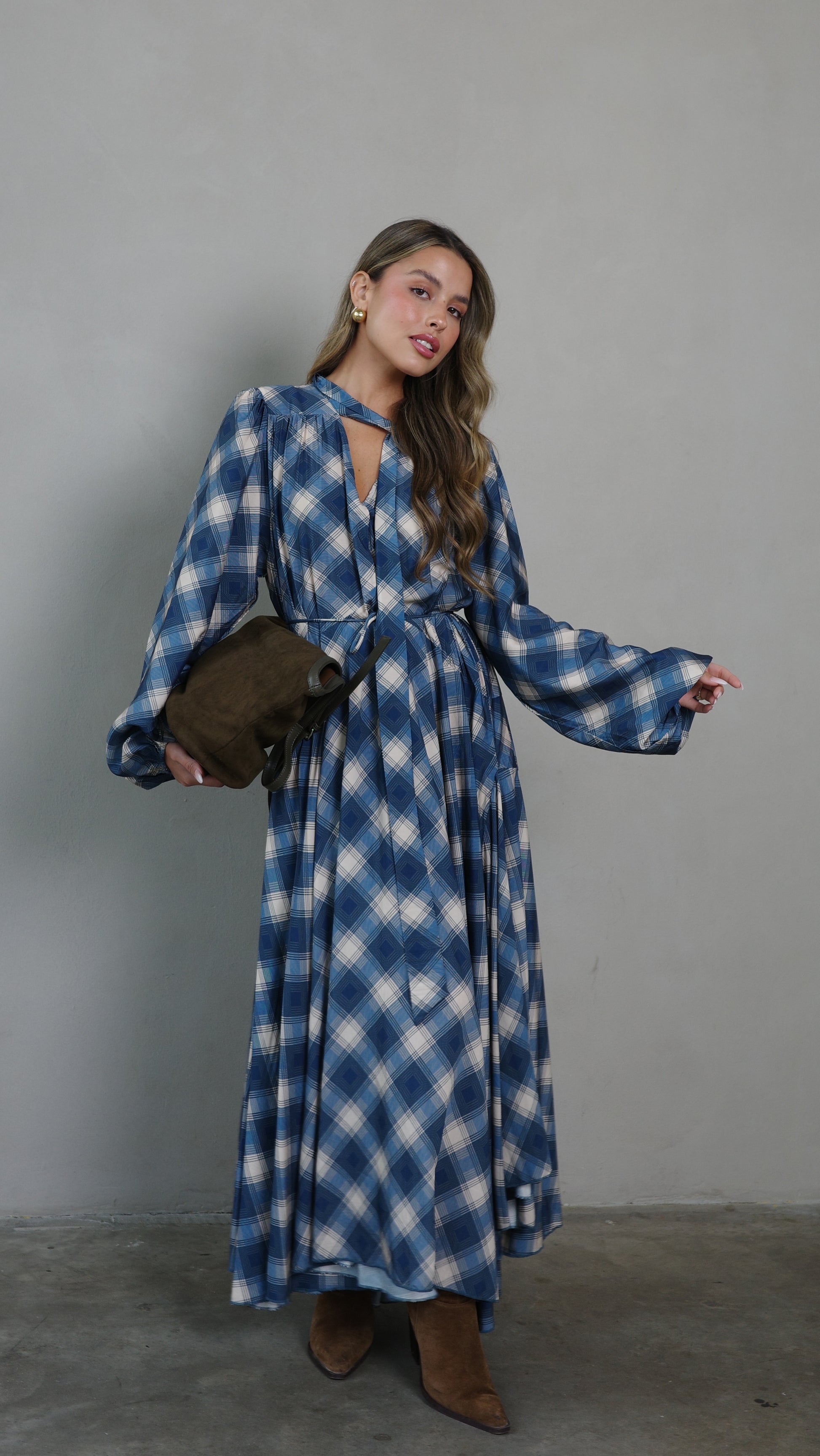שמלת קלוש עניבה קארינה משבצות | בז/כחול